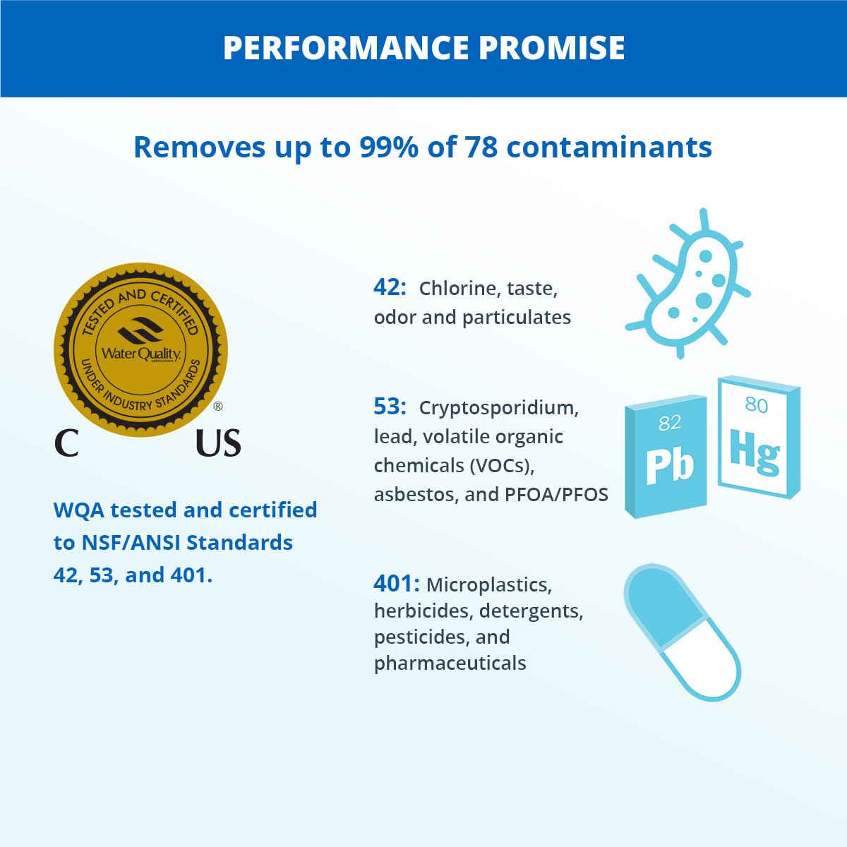 - Transform Tap Water Into Clean Water - Reduces up to 99% of 78 contaminants including lead, PFAS (specifically PFOA and PFOS), chlorine, pesticides, & more while leaving healthy minerals. This system will NOT reduce Total Dissolved Solids (TDS)