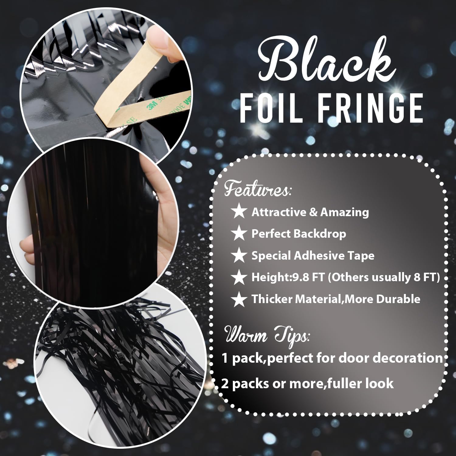 - Package Includes:5 pack black foil fringe curtain,3.2 ft x9.8 ft each,suitable for hanging on a door or coverage a wall fully
