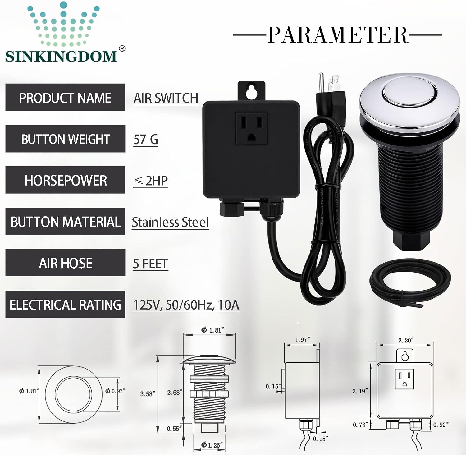 - Digital: 3.20"x 3.19"x 1.97" Power Adapter, 60.00" Air Tube and 40.00" Power Cable, 3.58"x 1.25" Air Switch Adapter Button, 1-1/4"Countertop Hole at Least, 2HP, UL Certification.