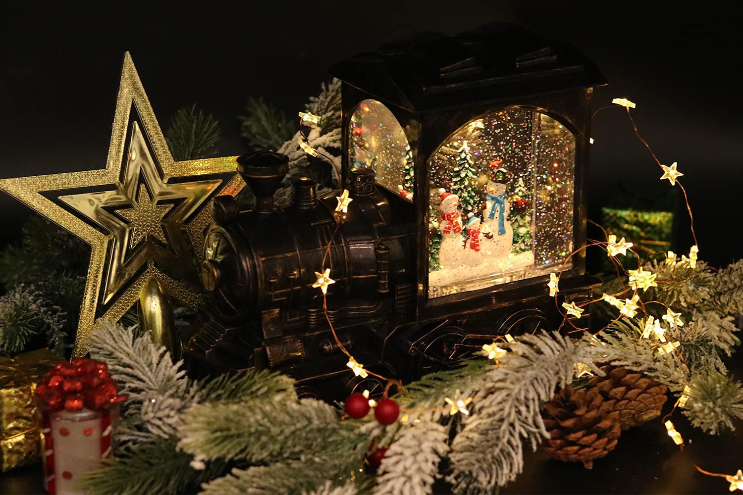 - CHRISTMAS DESIGN: This train snow globe lantern inside the snow globe features Caroling Snowmen and evergreen trees with a gold star. It will be a good decoration for your party, can create an unforgettable memory for you.