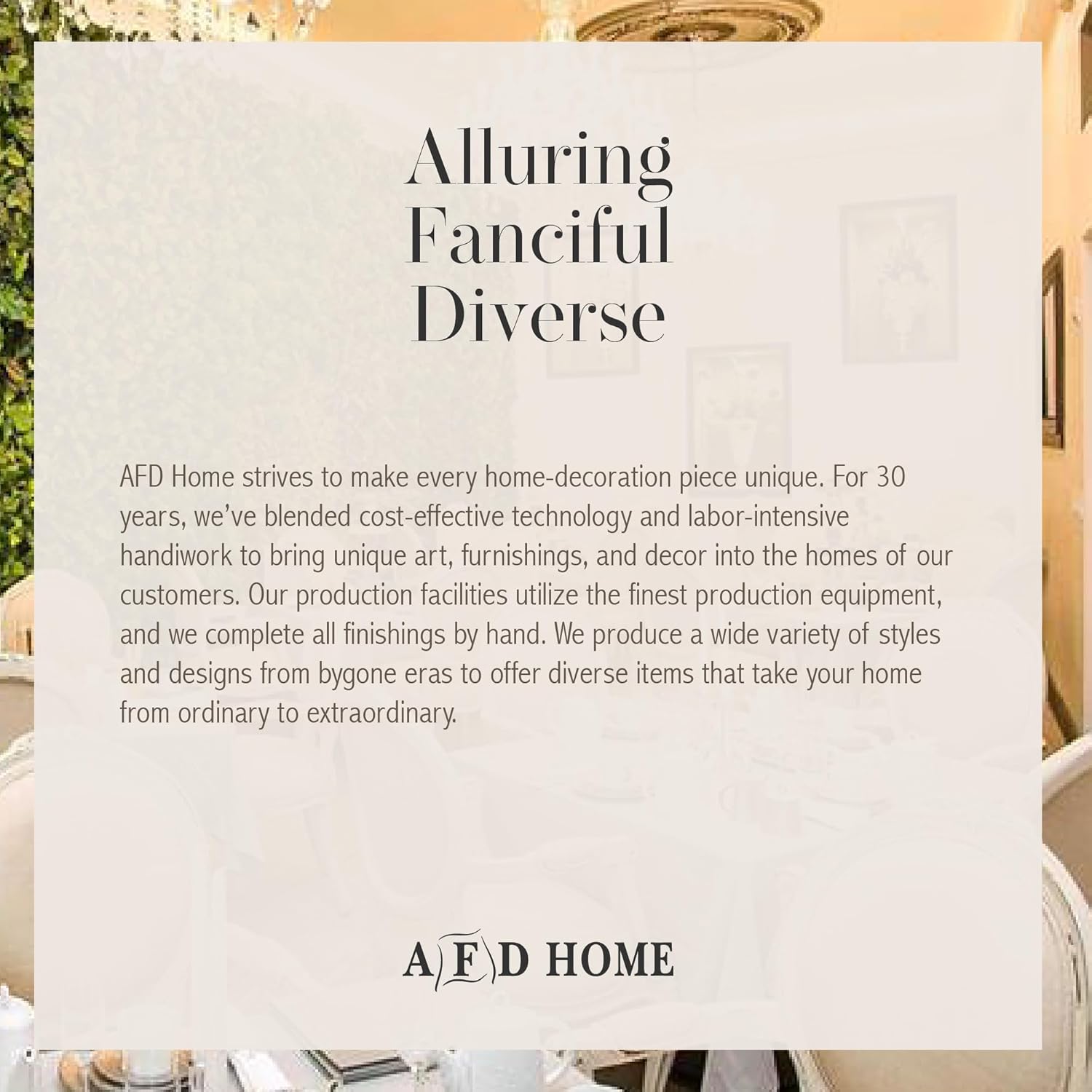 - UNIQUE ART, FURNISHINGS & DECOR: For 30 years, AFD Home has blended technology and craftsmanship to bring elegant pieces into your home. From antique-inspired room accents to reproductions of standout art pieces, weโll always have just the thing that makes your space feel unique.