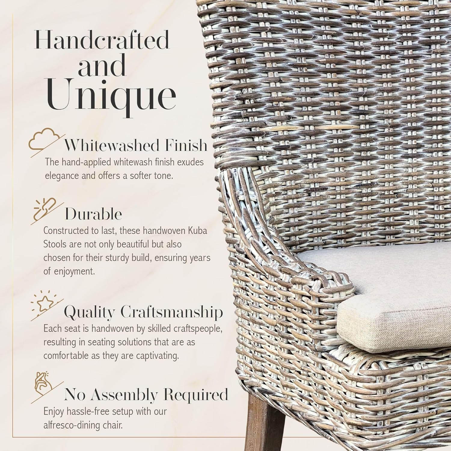 - BOHO-INSPIRED STYLE: The hand-applied whitewash finish on each woven chair exudes elegance and offers a softer tone, making it a perfect match for farmhouse, coastal, and lighter transitional interiors. Complete your ensemble with matching stools from the Alfresco Whitewash series.