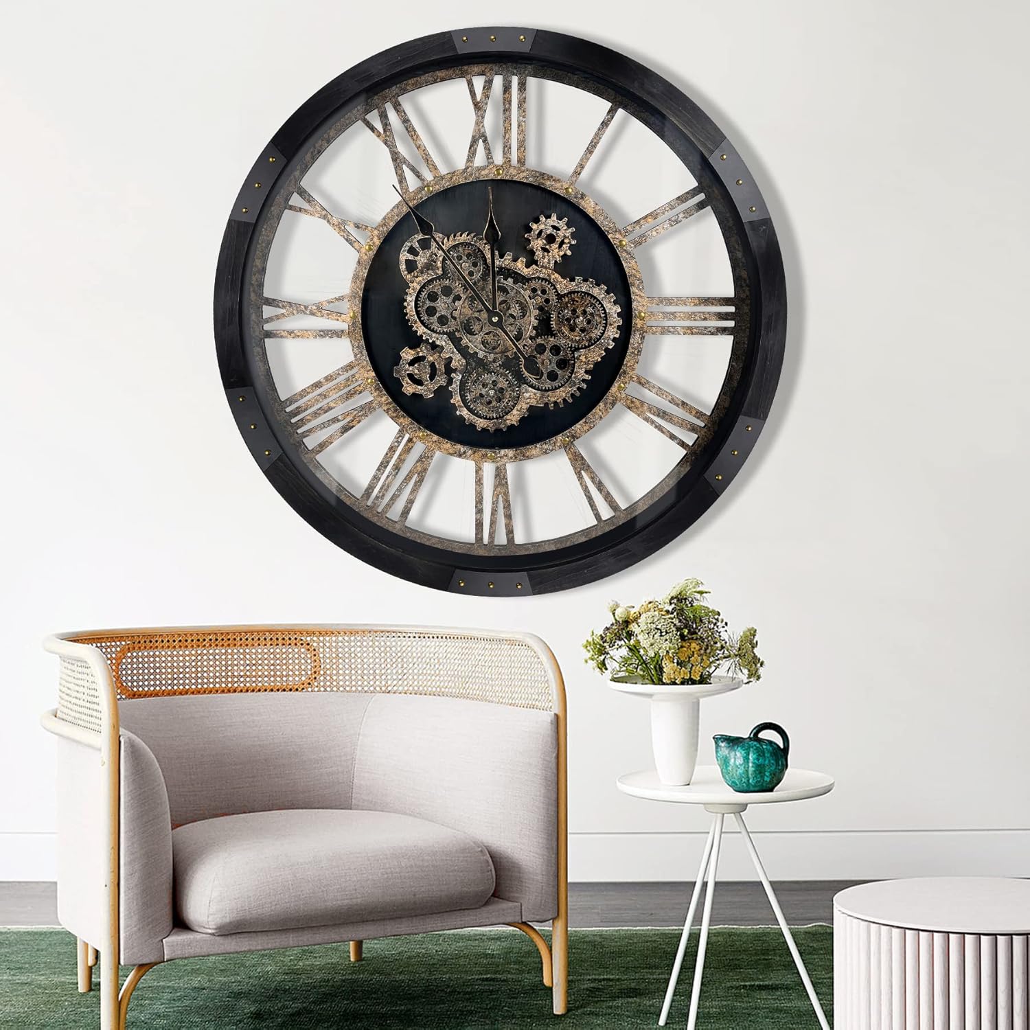 27 inch Large Real Moving Gears Wall Clock with Toughened Glass Cover, Oversized Solid Wood Retro Farmhouse Clock, Giant Decorative Rustic Wall Clock for Living Room Home Kitchen Office (Black)