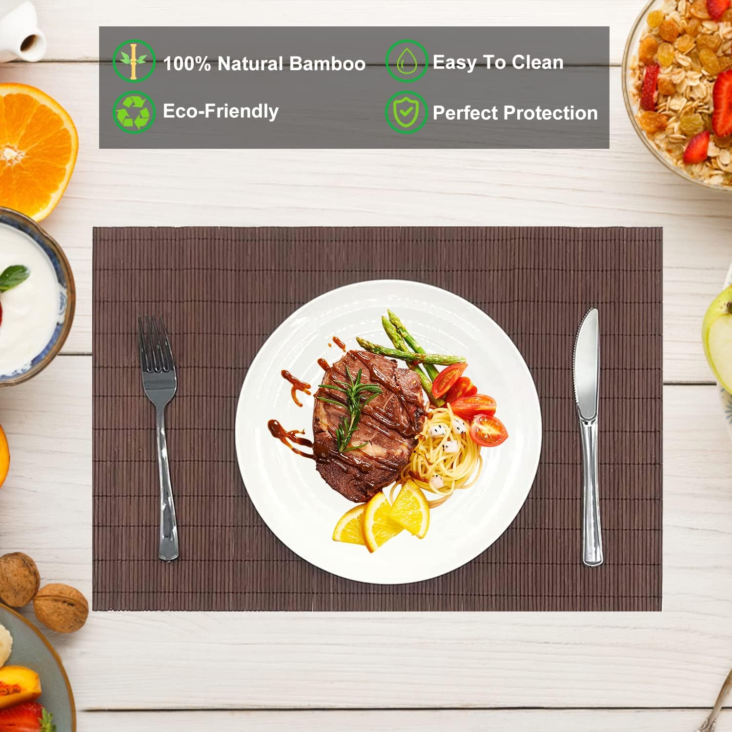 - 【PERFECT PROTECTION】:These bamboo placemats for dining table have a special heat insulating effect that protects any table from damage. The bamboo mats act as a shield between hot plates and your table, while also preventing spills, crumbles, or stains from destroying the furniture.The anti-slip feature can also effectively protect you and your family during meals.