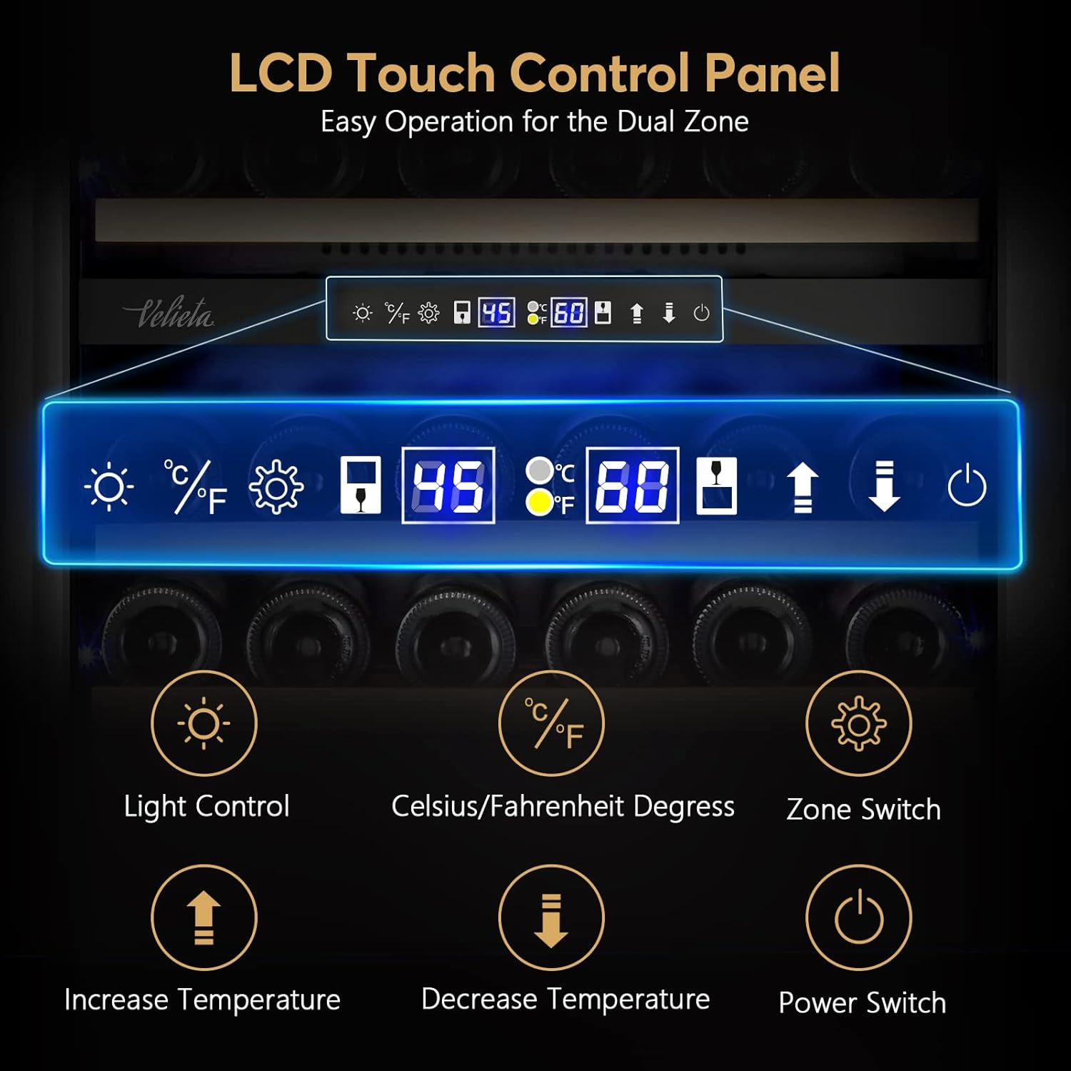- 【Temperature Memory Function & Smart Control】 Restore the set temperature in the wine cooler after it is back on from power lost automatically Besides Velieta wine fridge has a smart LED control display that makes it easy to operate.