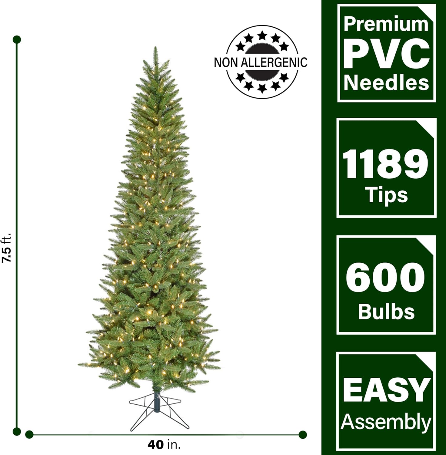 - 7.5-Foot Slim Tree: Standing 7.5-Ft. tall this traditional pine tree will fit perfectly in your room with 8-ft. to 9-ft. ceilings; The 40 inch skinny diameter is great for small spaces, apartments, or as your second, third, or fourth tree