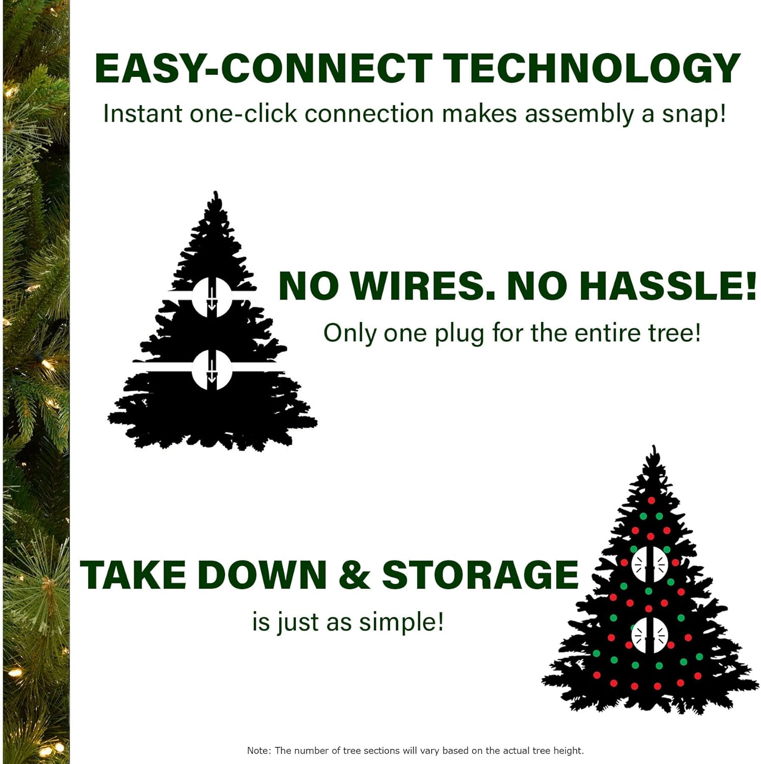 - Prelit with Easy Connect Technology and Long Lasting LED Lights: Pre-strung with 600 warm white 8-function LED lights to bring a festive glow to your home; Instant one-click connection makes assembly a snap; No wires, no hassle, one plug for the entire tree