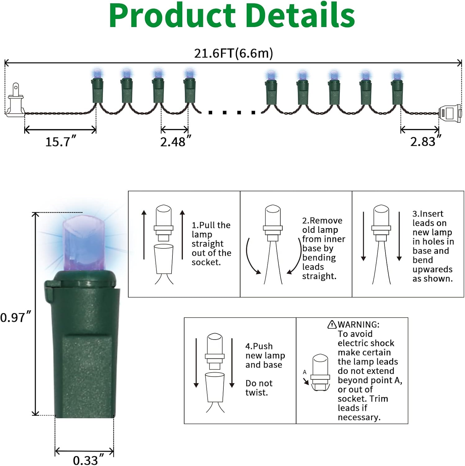 - 5mm LED Christmas Lights: 100 counts warm white 5mm wide angle stable LED string lights spaced 6.3 inches apart with green wire. 7.1 inch leads have a stackable male plug and 5.9 inch tails have a female plug for easy end to end connection.