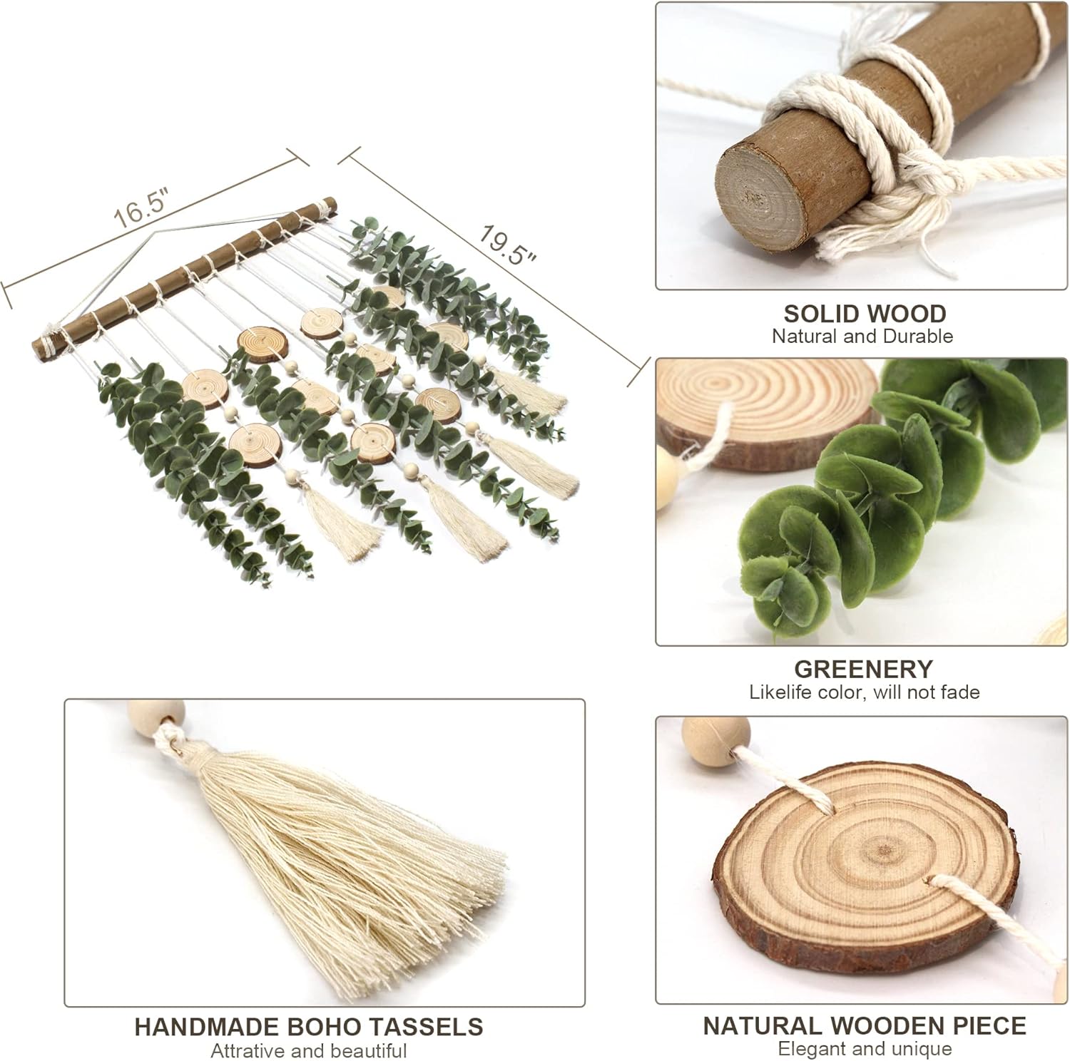 - 【Purely Handmade, Value for the money】 This eucalyptus wall hanging is pure handmade. No two items are exactly alike, may vary slightly in shape and size due to each detail being carefully hand crafted. Eucalyptus vines, wood slices, beads, handmade tassels are purely hand tied to the branches.
