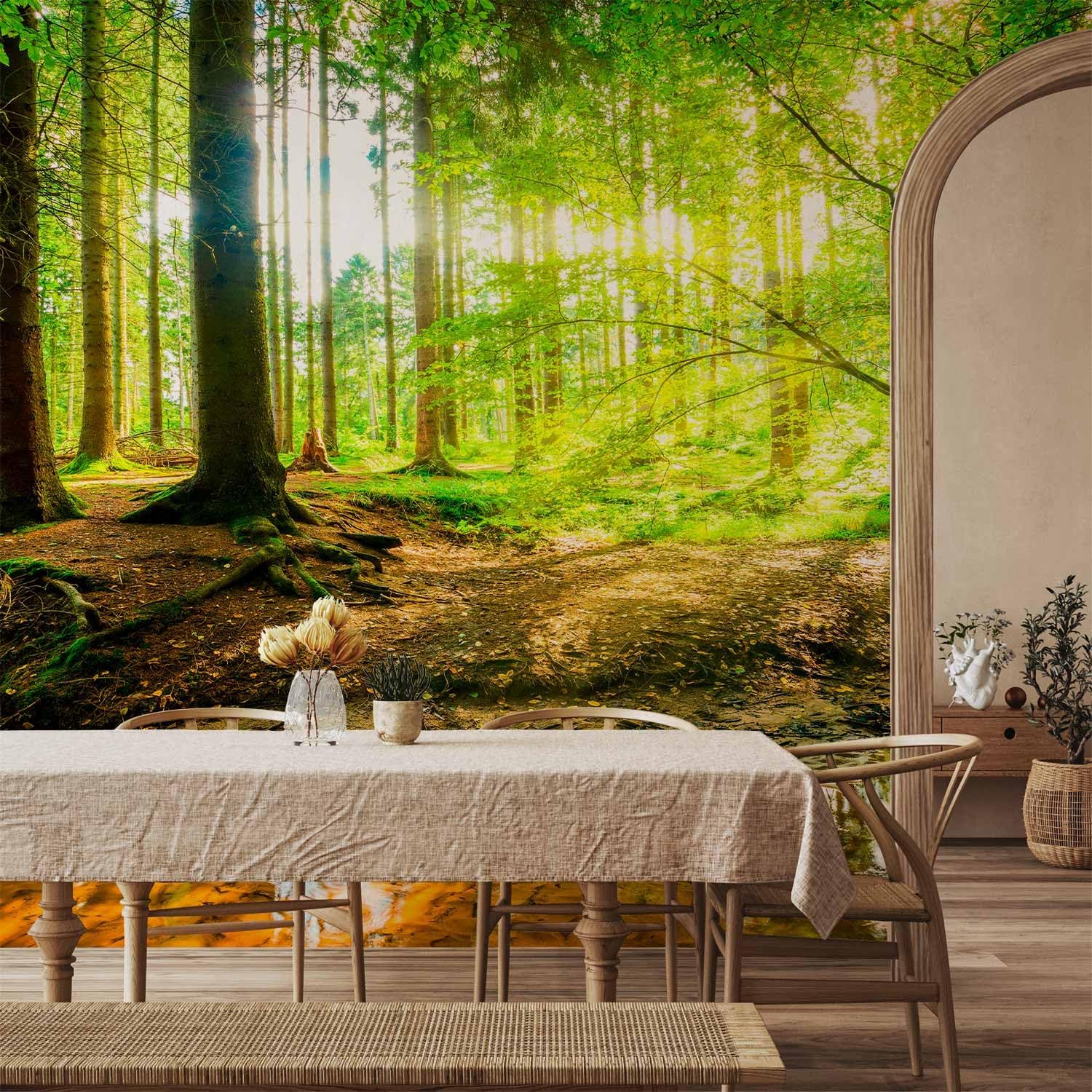 artgeist Wall Mural Peel and Stick Forest Landscape 212x98 in - XXL Self-Adhesive Corner Wallpaper Removable Large Sticker Foil Angle Wallpaper Wall Decor Print Green Sun Nature Tree c-B-10040-a-a