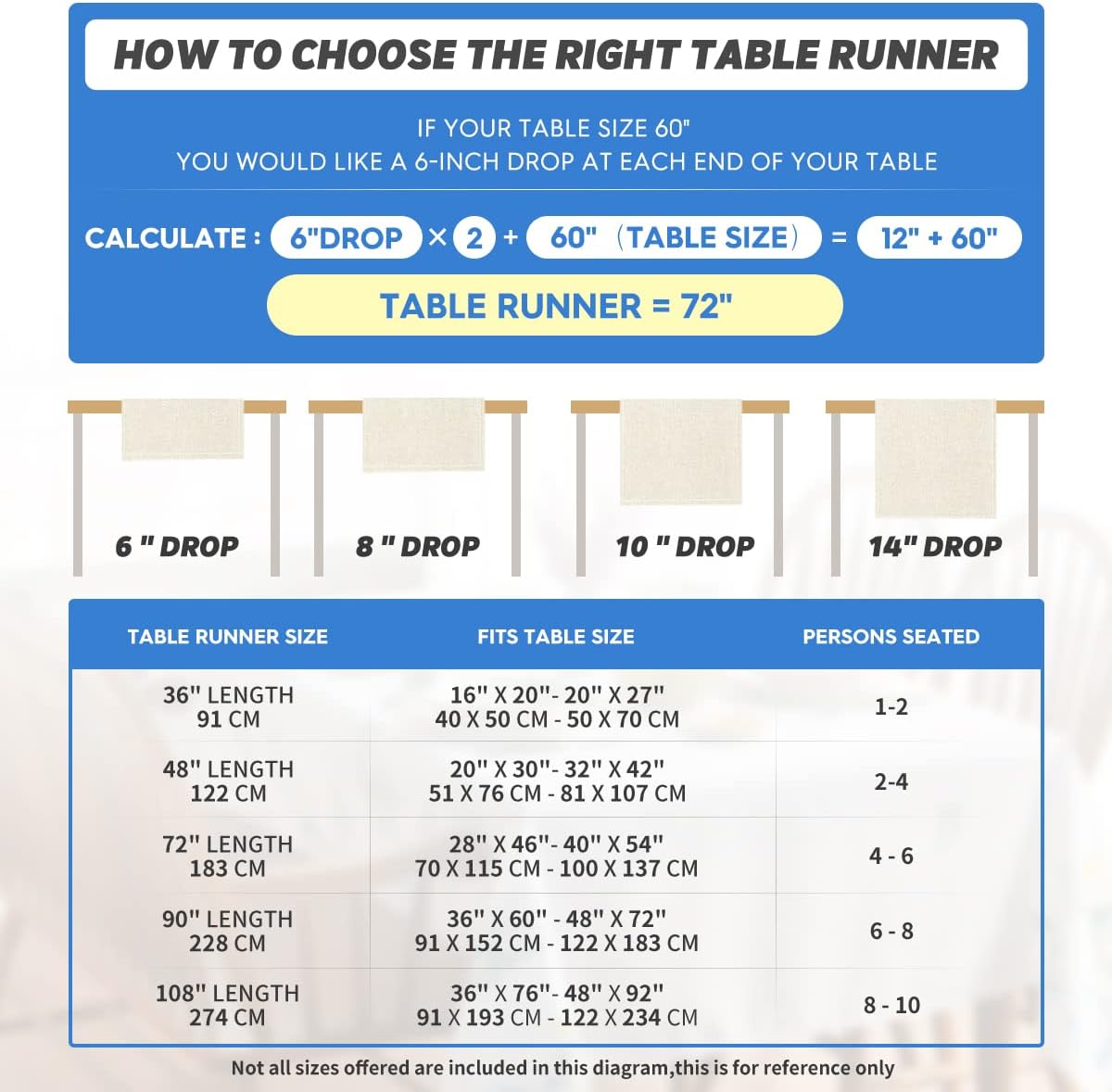 - Fits Table Size : This table runner is 13 x 48 inch, appropriate for a table that can seat 2-4 people, better match your table and give you a delightful dining experience