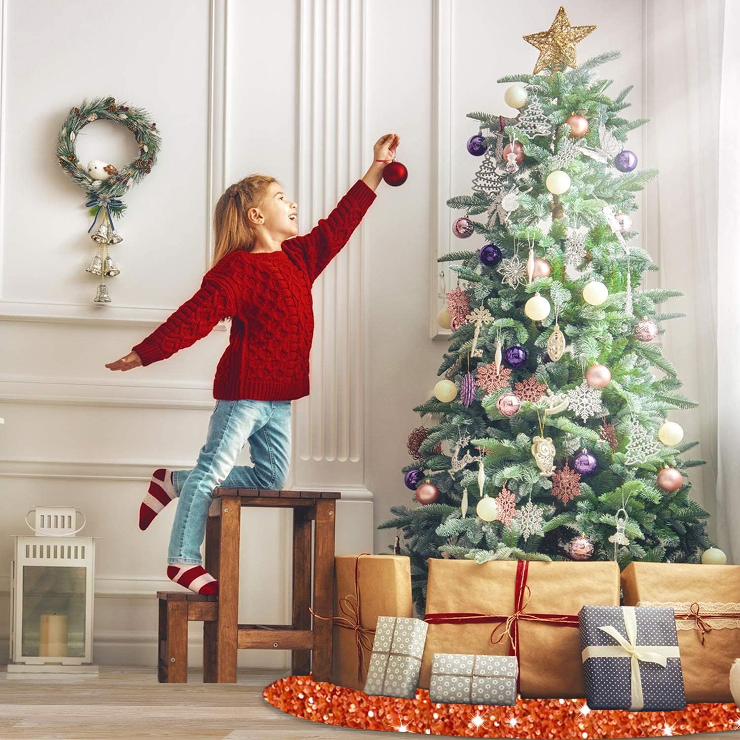 - ❄️【Size Detail - Orange Tree Skirt】You will receive a 36 inches diameter burnt orange glitter sequins tree skirt, fits under 6 foot tall trees. You can put some gifts, Christmas boxes, Christmas ball on the xmas tree cover mat. The sparkle velour Christmas tree skirts is perfect for decorating your home and become part of your holiday tradition.