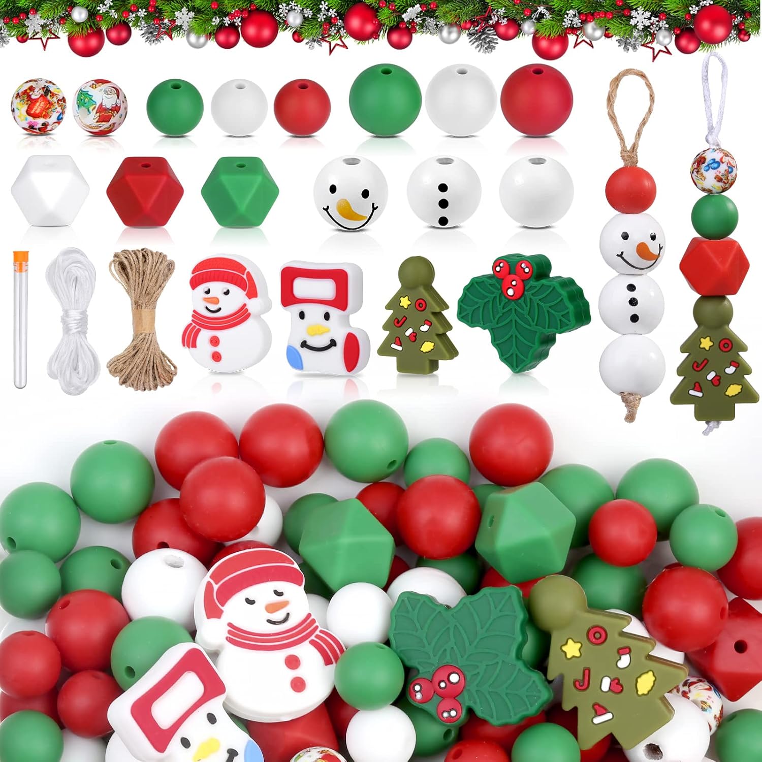 - 𝐂𝐡𝐫𝐢𝐬𝐭𝐦𝐚𝐬 𝐛𝐞𝐚𝐝𝐬 𝐁𝐮𝐥𝐤 𝐟𝐨𝐫 𝐃𝐞𝐜𝐨𝐫 Lucomb silicone beads contain 12mm 15mm of round rubber beads with 3 different colors (white, red, green), 14mm polygon silicone beads, 16mm white wooden beads, Christmas stocking shape, Snowman, Christmas tree, Leaves-shape silicone spacer beads, ropes, big eye beading needles. All the color of beads is classic and rustic, string these all up may be making garland lanyard and tassels or decorating somewhere in the house for Christmas Decoration.