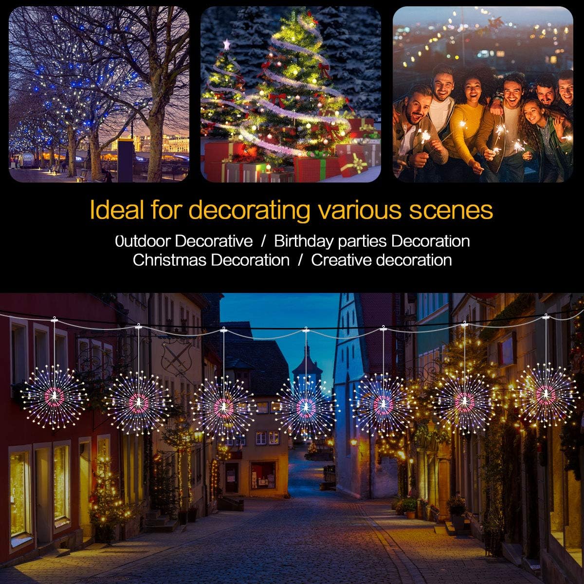 - 【Waterproof and Outdoor Applications】: The firework lights starburst light with remote has a waterproof rating of IP44 and can be used in rain and snow. Each firework light outdoor has a small hook that can be decorated on eaves, trees, Christmas trees, yards, tents, Living room, bedroom, corridor, etc.
