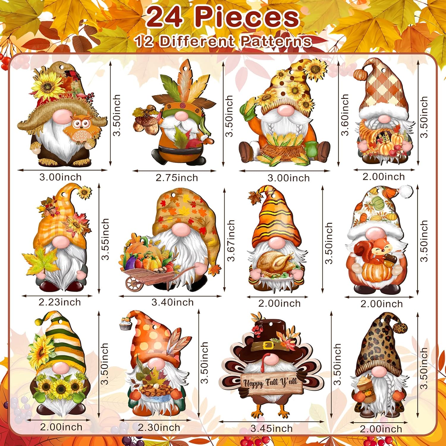 - New Designed Thanksgiving Gnome Wooden Ornaments -- 24 PCS gnome wooden slices with exquisite workmanship in 12 different styles are made of high-quality wood, painting in front and empty at back.
