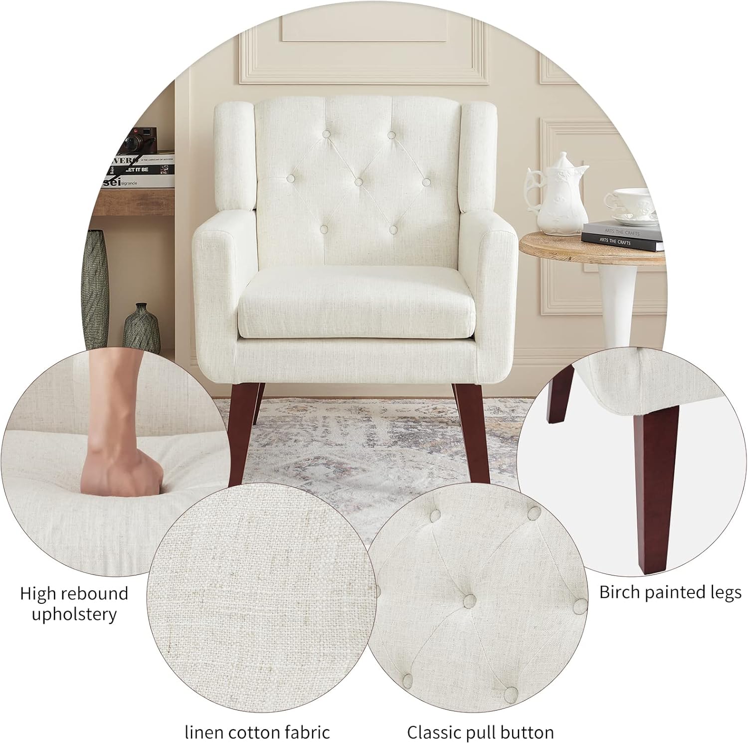 - 【MID-CENTURY MODERN STYLE】Our living room chairs are linen cotton fabric. Slim and aesthetic appearance design can match the interior decoration system of your home. And our bedroom chair won’t be kept out of date for several years. The tufted button of the living room chair back cushion is naturally classic, and the wood finish is very smooth and soft to the touch. Four colors can be selected to add a mid-century atmosphere to your room, which is a simple room decoration you can use.