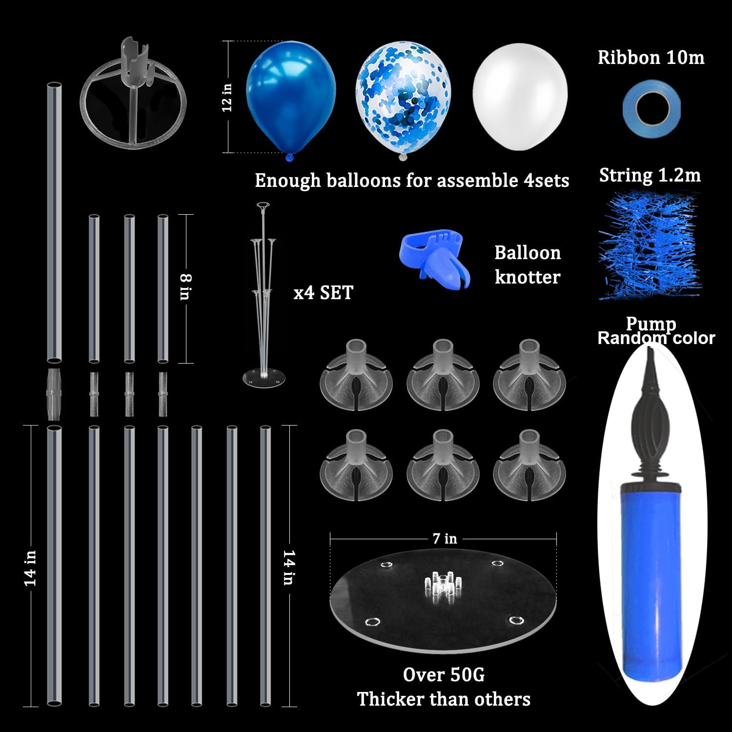 - WHAT INLCUDE: This balloon stand kit include 4 set balloon holders, 35 pcs balloons - blue and confetti balloons, white balloons, balloon pump, balloon clips, ribbons, glue dots and tie tool