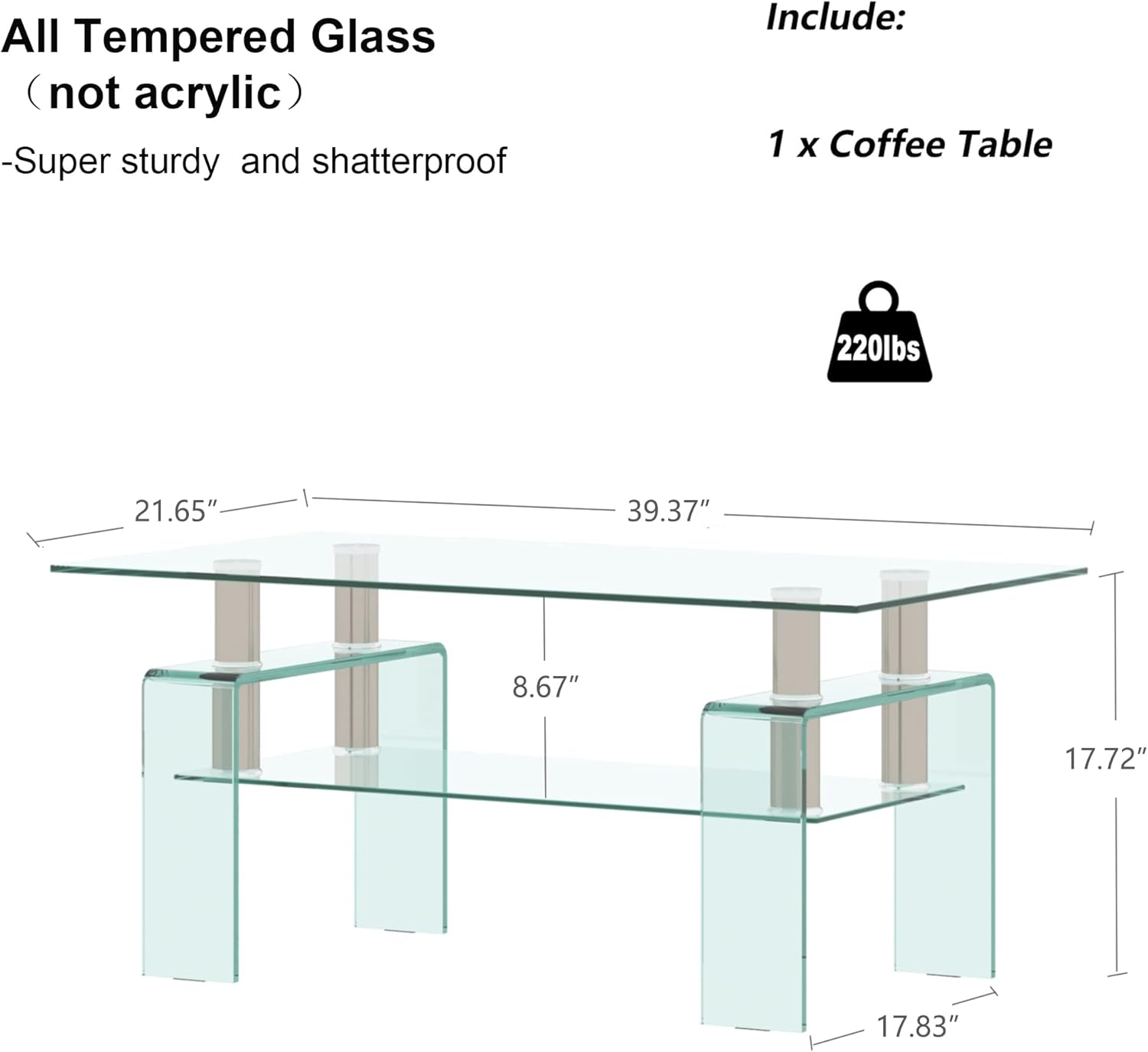 - Glass Coffee Table Size - The table size is 39.37” x 21.65” x 17.72”. The top glass thickness of 8mm and bottom glass is 6mm, the glass leg of 12mm provides high capacity of 220lbs.