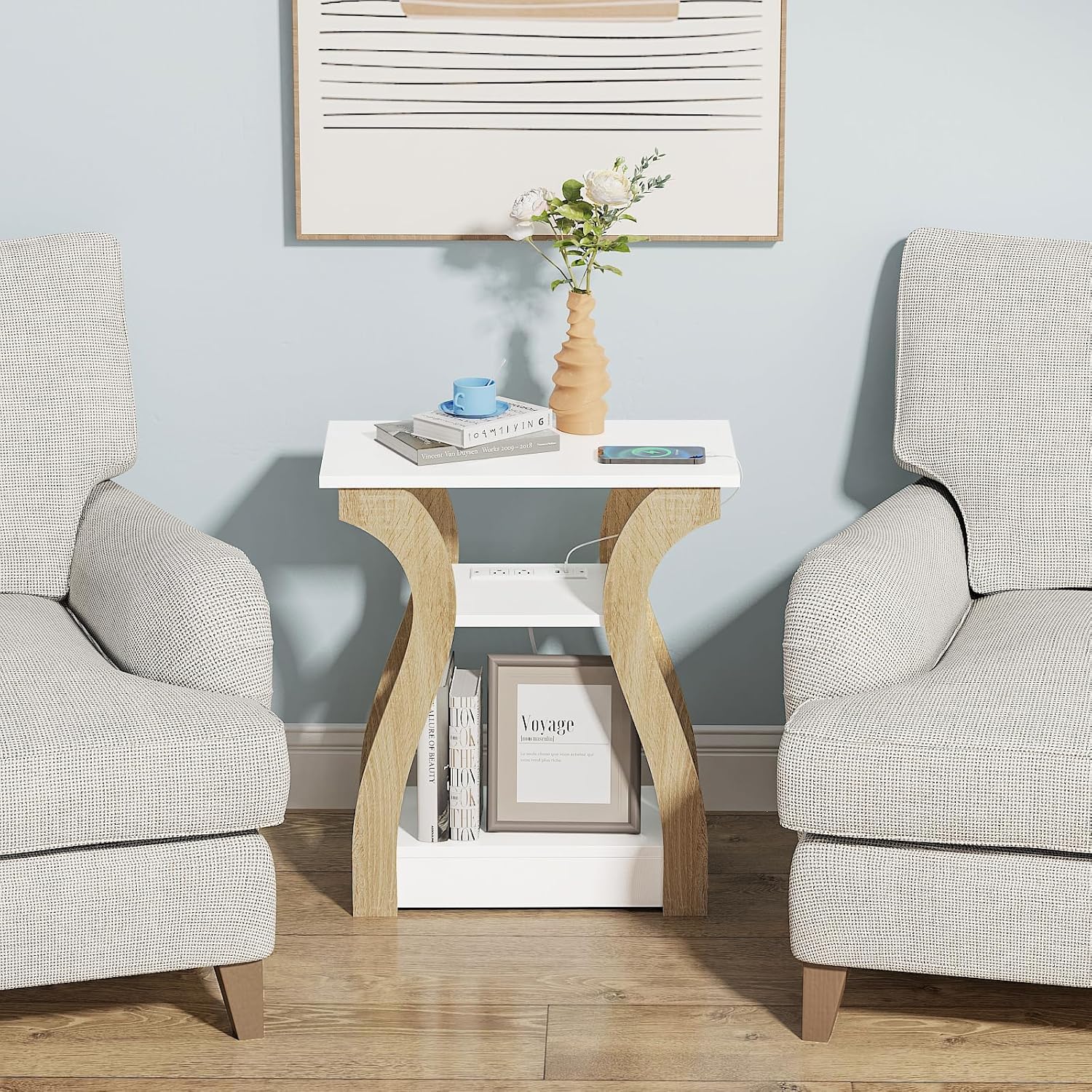 - 【Charming Multifunctional End Table】The simple arc gives this end table a striking outline, and the smooth oak pillar creates a low-key and luxurious appearance, which can be easily matched with various interior decoration.Convenient charging station, which can charge multiple devices and have a unique and simple appearance. Its functionality and appearance will certainly grant more visual interest and convenience to your room.