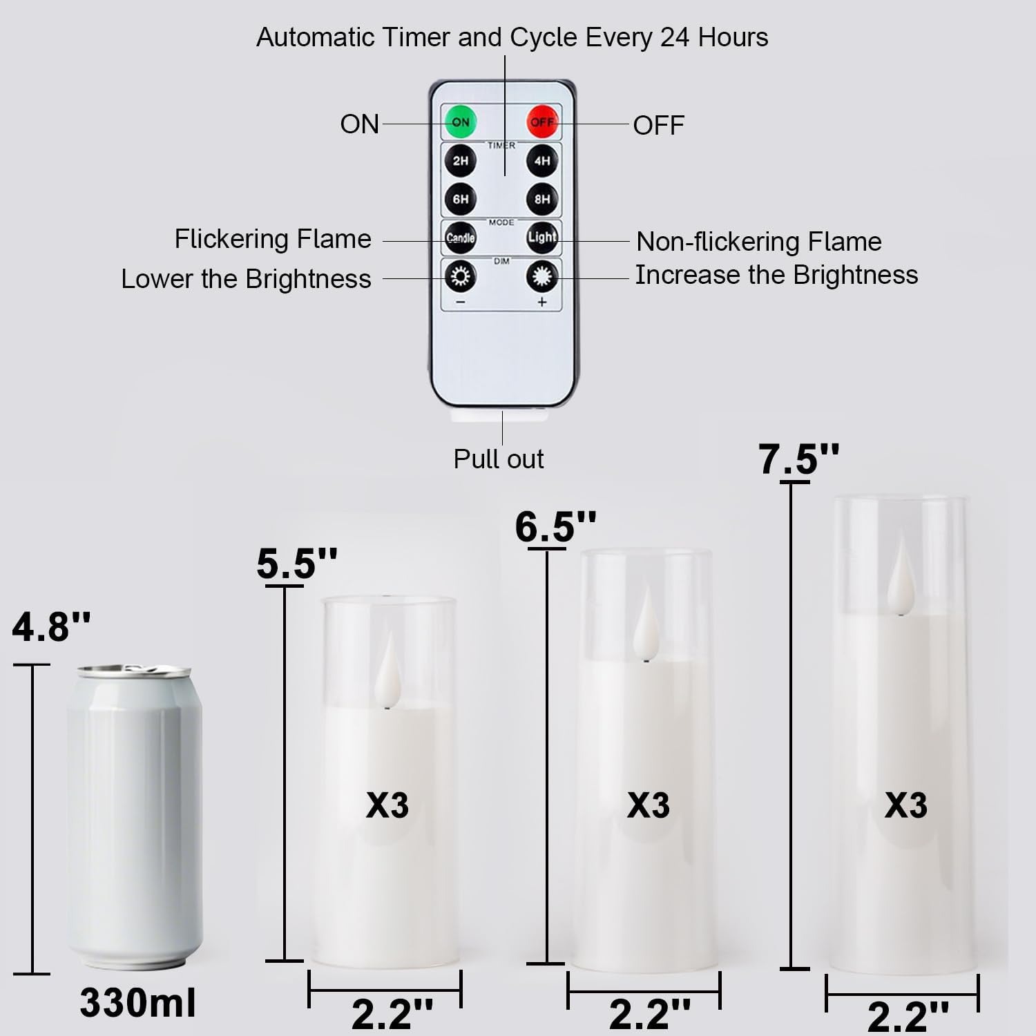- Remote Control & Timer Function: The smart 10-key remote control makes the operation more convenient and flexible: adjust the brightness, the light modes and set the timer freely within 50 feet. Set a 2H/4H/6H/8H timers will save your trouble to turn the electric candles on/off because they will come back on automatically at the same time every day