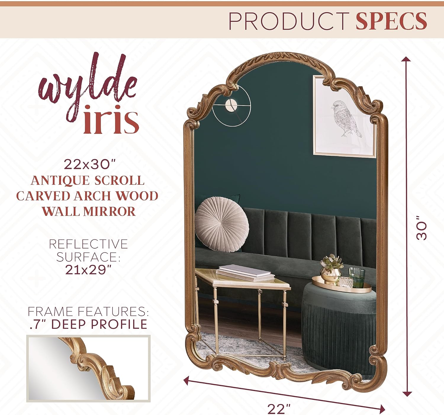 - QUALITY CONSTRUCTION: The Wylde Iris English Estate Framed Wall Mirror is crafted from carved engineered wood with glass front and features an antique gold finish.