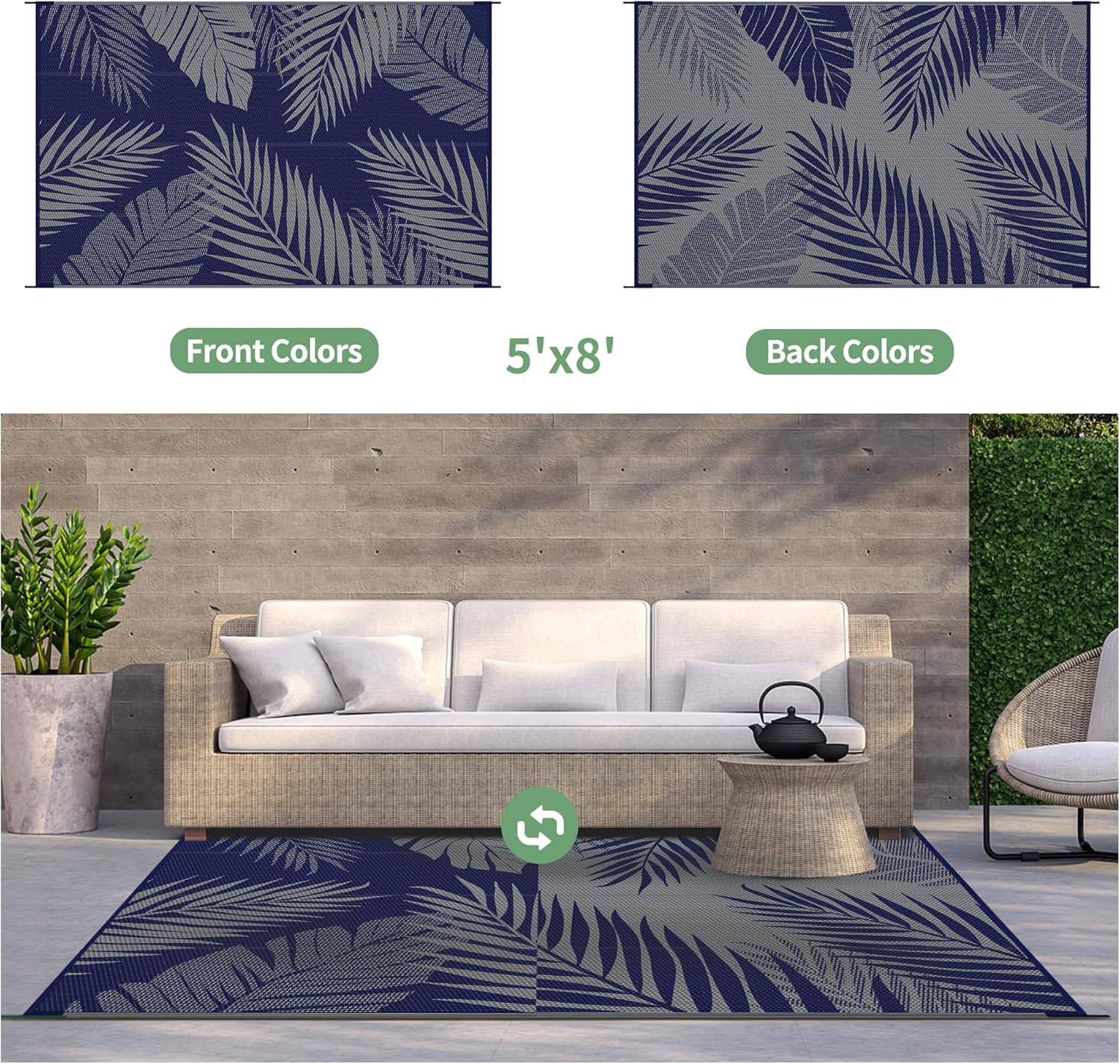 - Palm Leaf Design & Double-Sided Pattern: GENIMO reversible fall outdoor rug is designed with a double-sided pattern, completing the unique layout of multiple palm leaves. The 2 shades of blue and grey achieve the ultimate fusion. Either side can blend perfectly with nature and look very full and comfortable, making it a versatile piece for fall decor