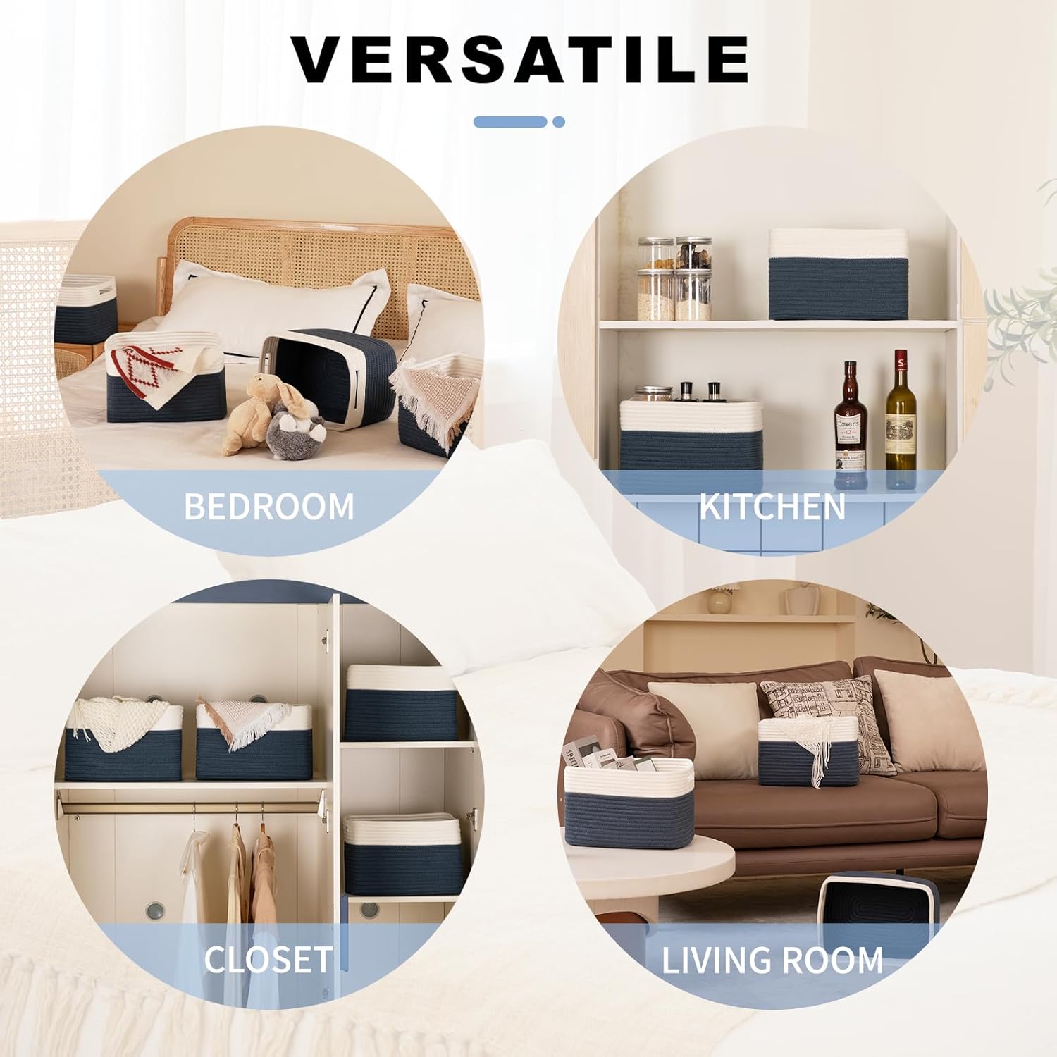 - Stylish and Elegant: SIXDOVE Cotton Rope Storage Basket. The woven design of these baskets adds a touch of rustic charm to any room decor, making them a perfect addition to your living room, bedroom, bathroom, or nursery. These cube rope storage baskets enhance any room or decor of your home
