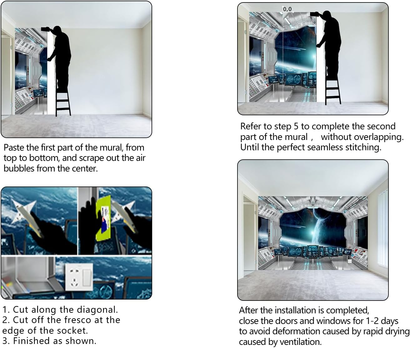 - It's easy to install: at the bottom of each mural we have a numbered sequence, You can refer to the instructions we provided and the main picture 6-7,just match the numbers and you'll be amazed!