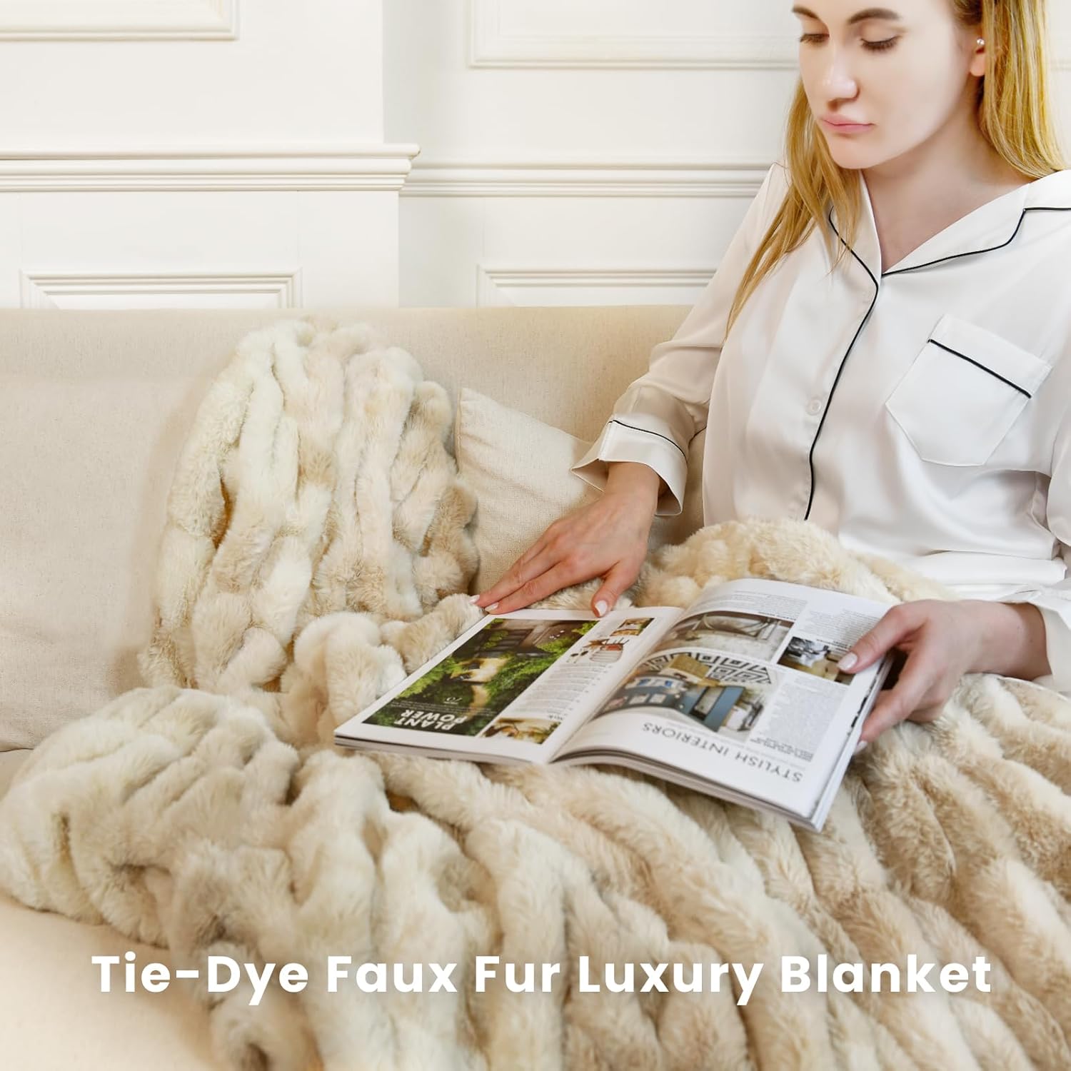 Faux Fur Blanket, Throw Blanket for Couch, Fluffy Blanket with Stretch Ruched Design, Ultra Soft Giftable Home Decor, 50x60 inches, Tie-Dyed in Khaki