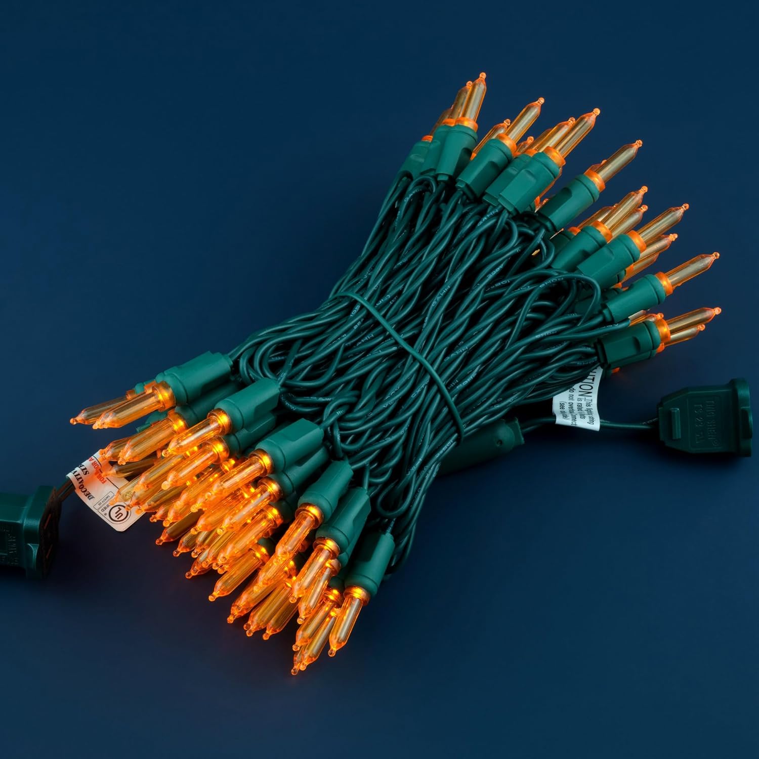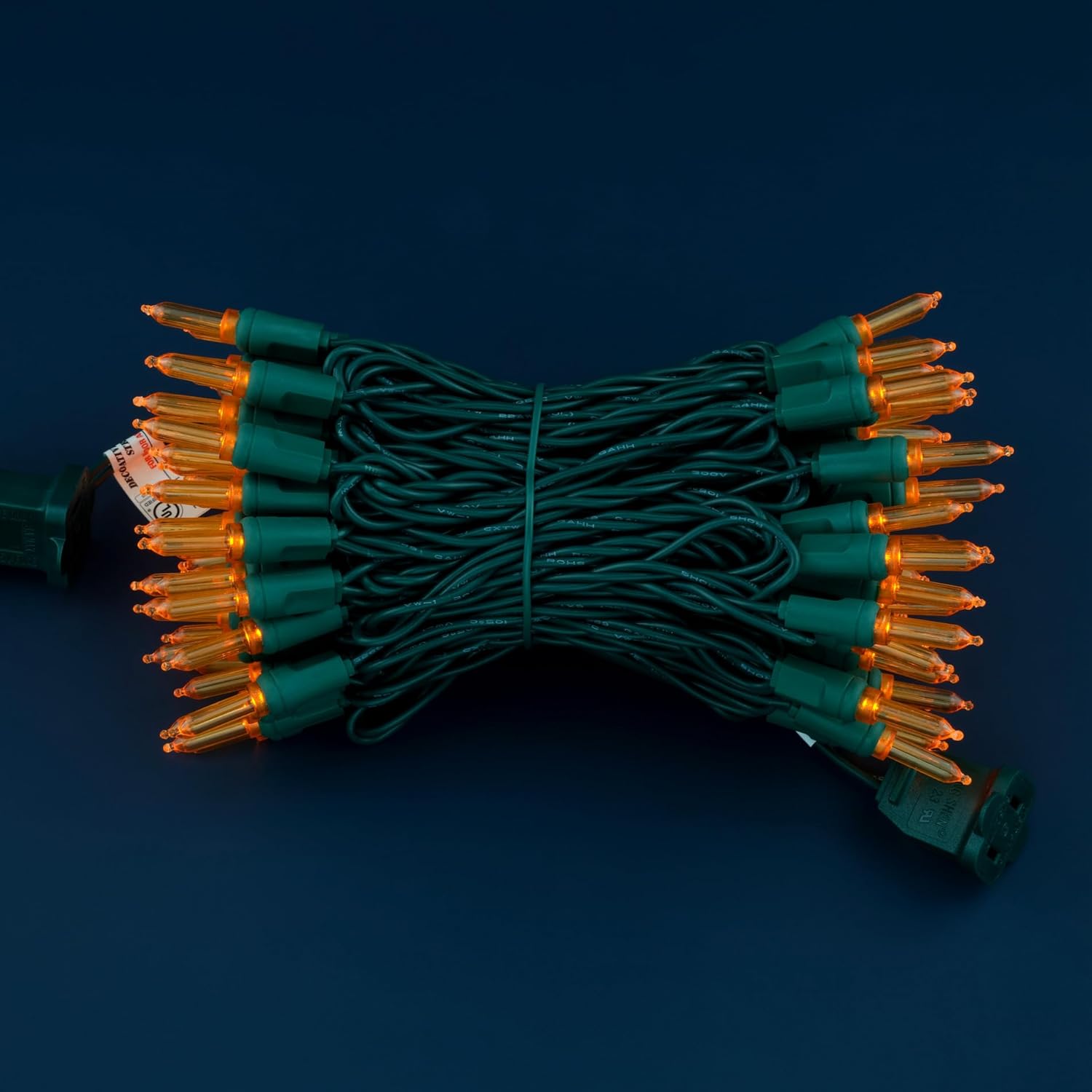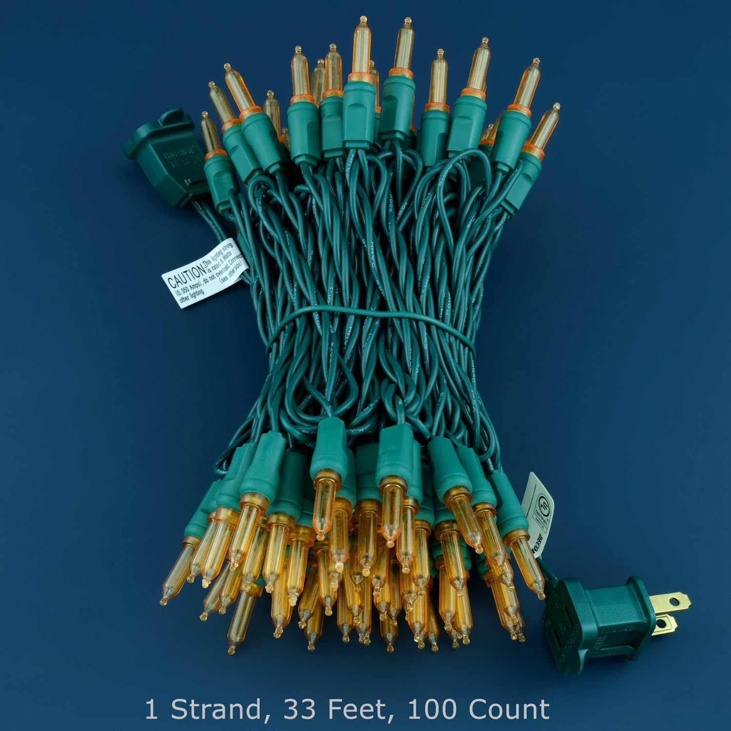- SPECIFICATIONS ☀ Each pack contains 1 strands of one-piece string lights, total length 33 feet with 100 count orange mini lights. 22 AWG green cord, 4" lead, 4" spacing, 4" tail.