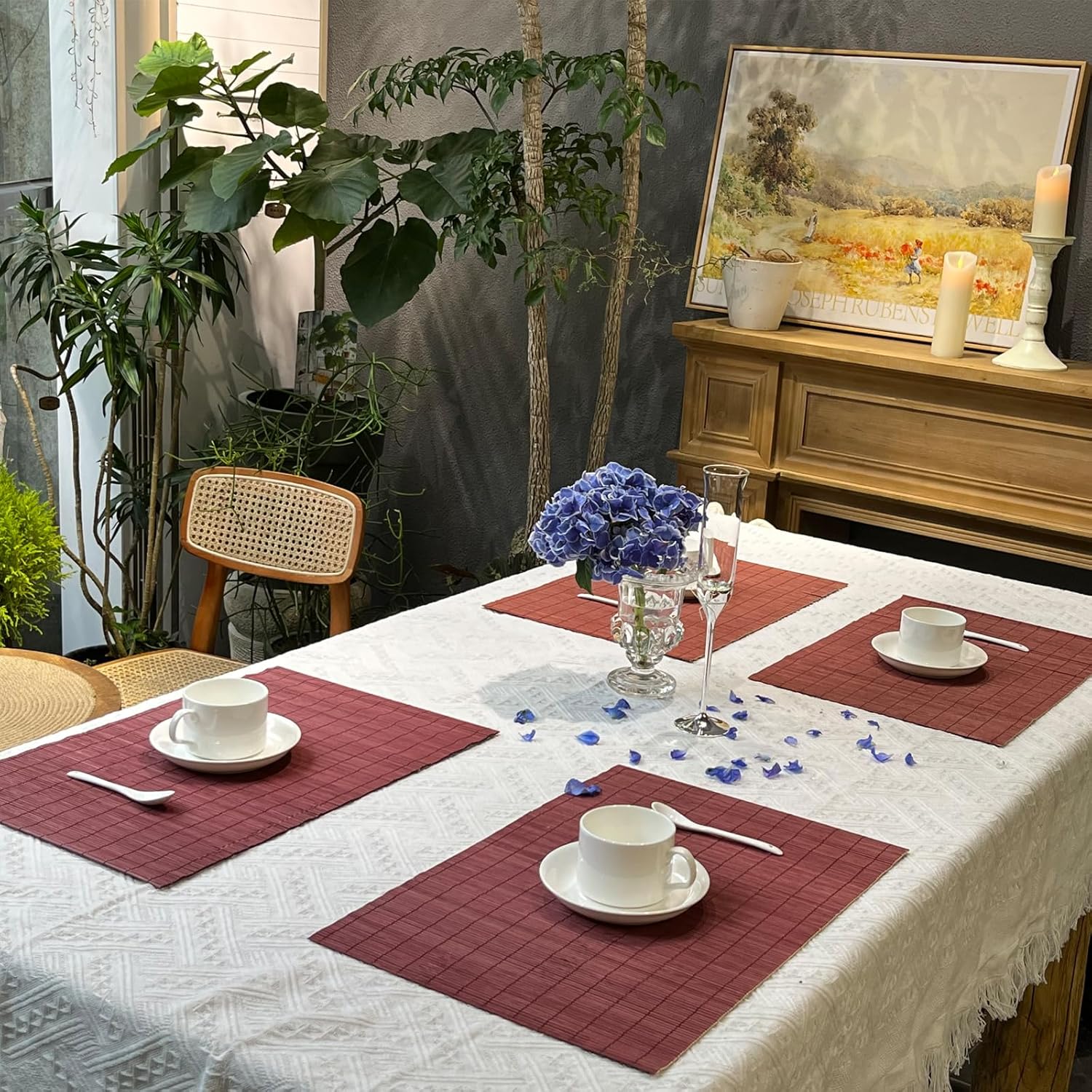 - 【PERFECT PROTECTION】:These bamboo placemats for dining table have a special heat insulating effect that protects any table from damage. The bamboo mats act as a shield between hot plates and your table, while also preventing spills, crumbles, or stains from destroying the furniture.The anti-slip feature can also effectively protect you and your family during meals.