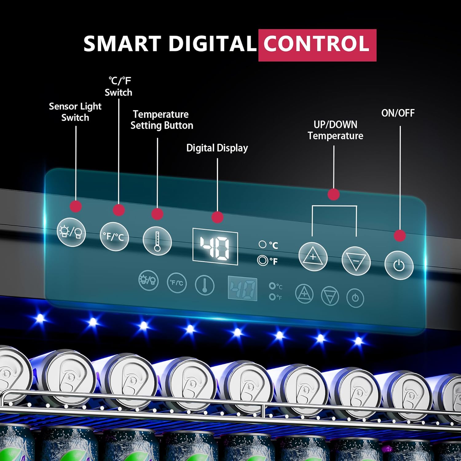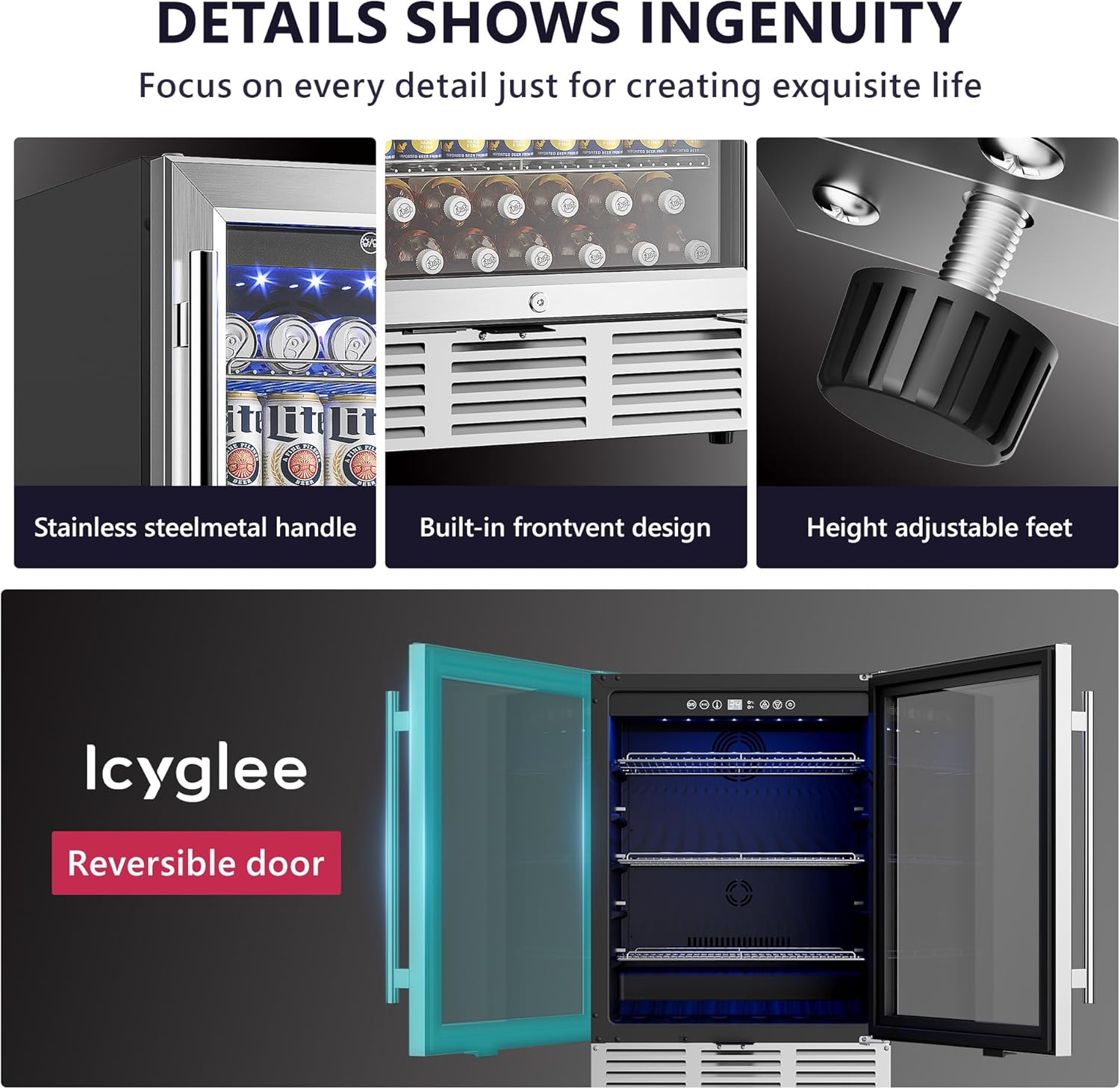 24 Inch Beverage Refrigerator, Beverage Cooler 180 Can Built-in Design, Under Counter Beer Fridge with Glass Door for Soda, Wine, Water - For Kitchen, Office or Bar