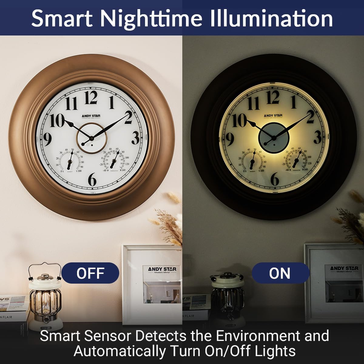 - Smart Light Sensor Technology: This 21 inch outdoor clock with temperature automatically illuminates with a warm backlight in the dark. It's easy to read from afar even then; The smart sensor lights up a warm glow at night and turns off in daylight;Select from Always On, Off, or 4 - hour timer backlight modes