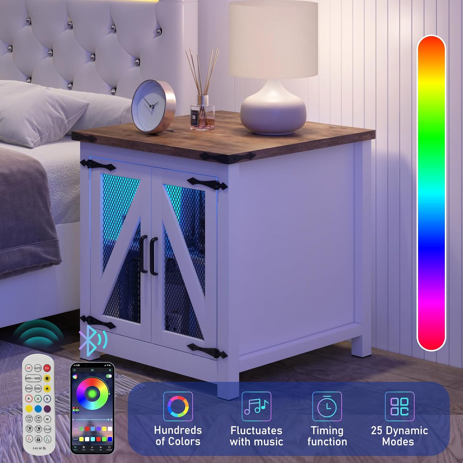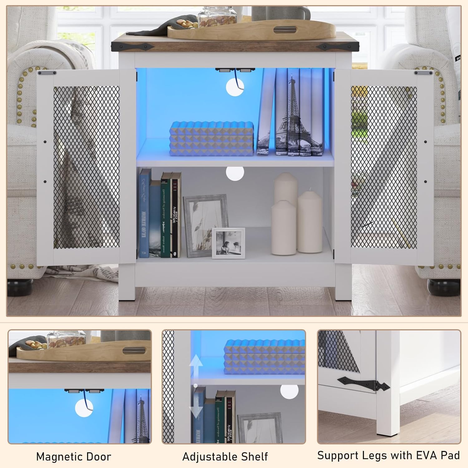 Farmhouse End Table, 24" Large Sofa Side Table with Charging Station, Mesh Barn Door, and Adjustable Storage Shelf, Rustic Wood Square Nightstand for Living Room, Bedroom, Office, White &Brown