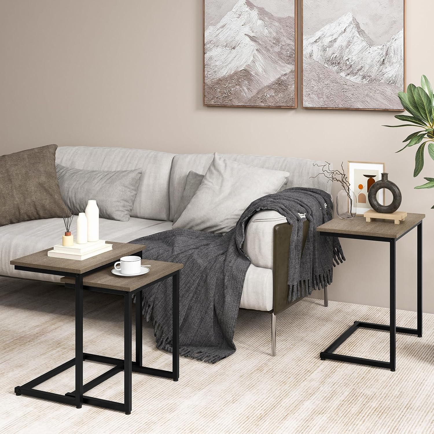 Giantex Nesting Coffee Table Set of 3, Stackable Square End Table w/Wood Grain Tabletop & Heavy-Duty Metal Frame, Farmhouse C-Shaped Accent Table for Small Space, Living Room, Bedroom (Black Oak)