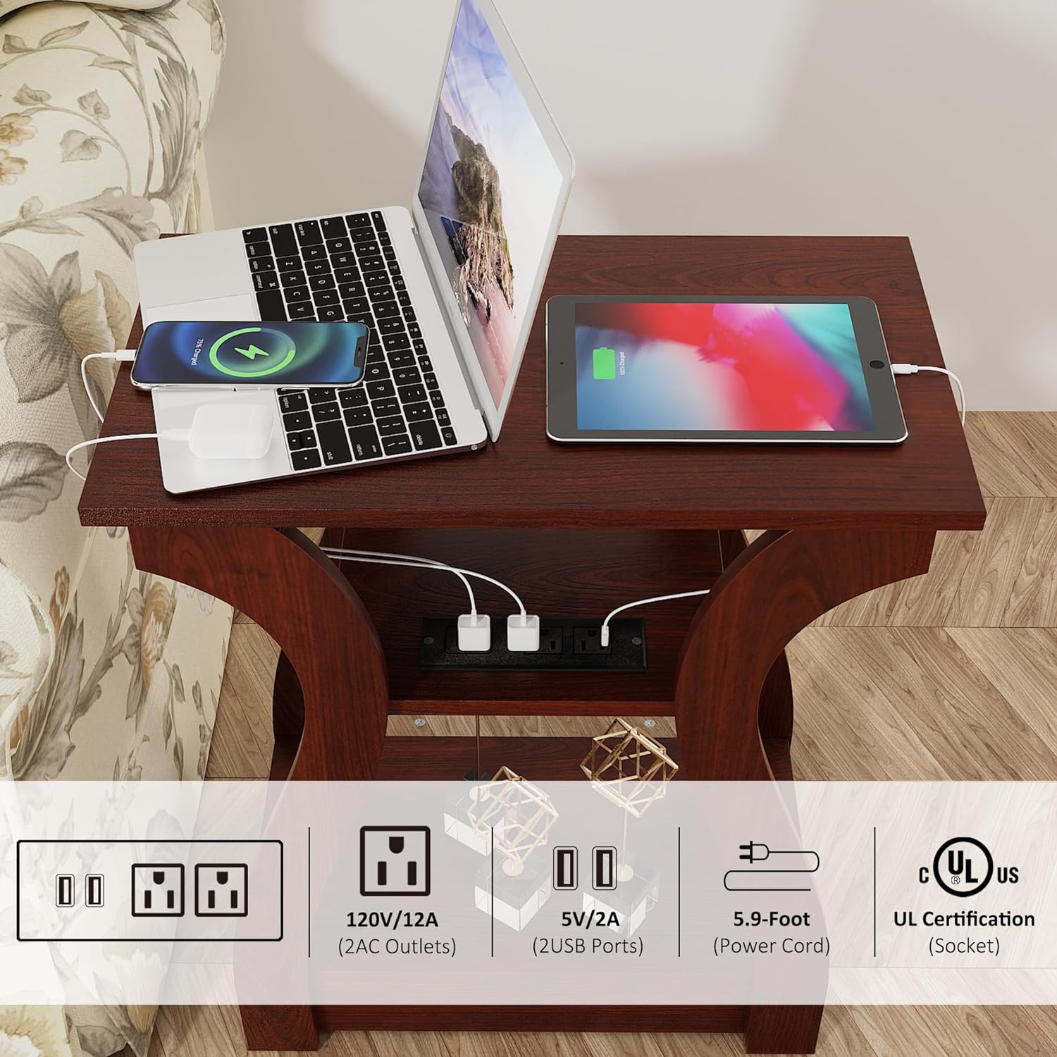 - 【End Table with Charging Station】The end table with USB ports and plug outlets is very convenient for you to keep your mobile phone, ipad and Labtop within reach when charging. The charging station includes two sockets, two USB ports and a 5.9-foot long power cord, which ensures it can be charged up to four electronic devices at the same time, providing convenience.