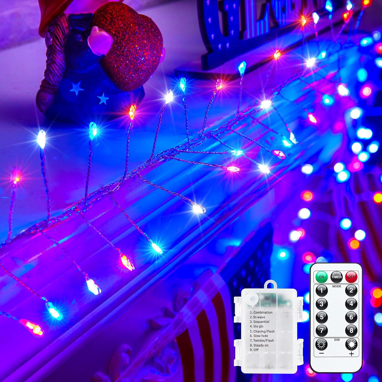 4th of July Decorations Red White and Blue Fairy Lights Battery Operated, 10 Feet 120LEDs Firecracker String Lights with Remote, Twinkle Lights for DIY Wreath Indoor Outdoor Independence Day Decor