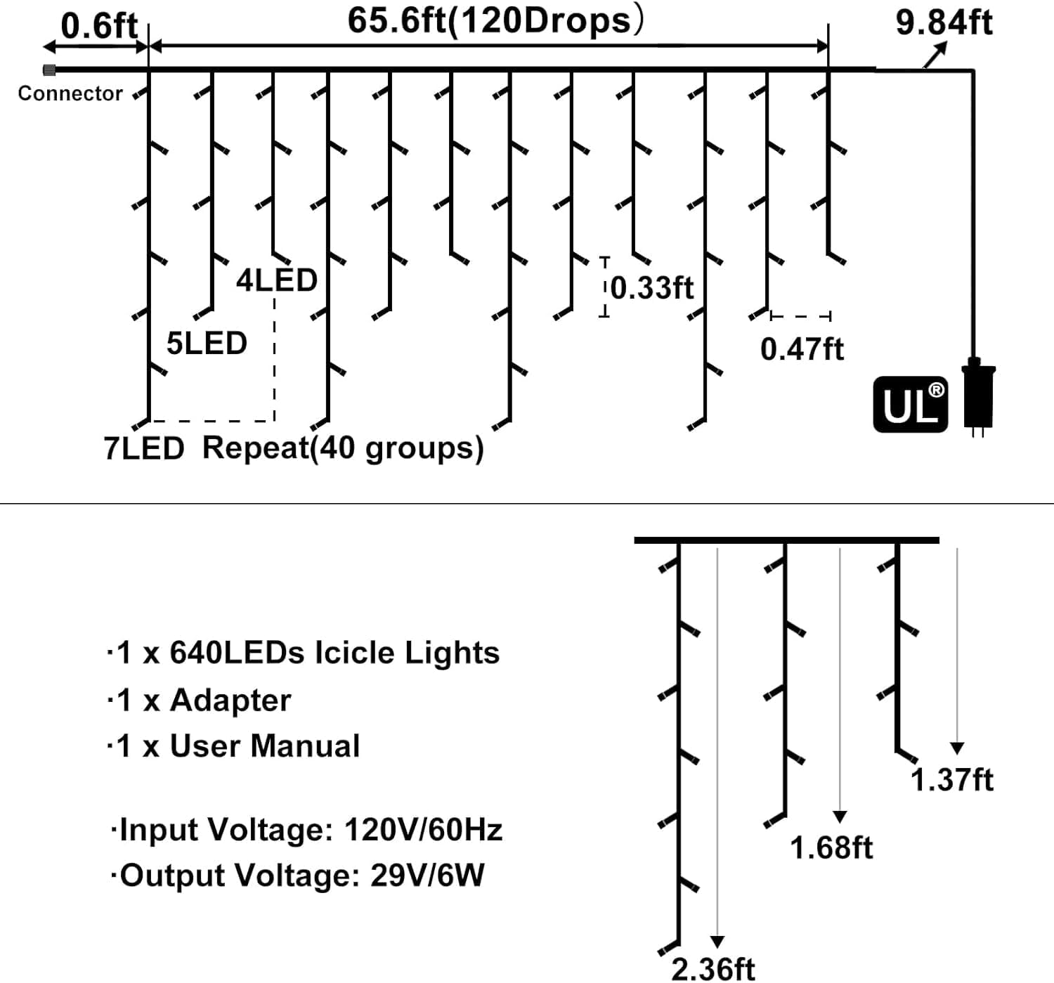 - Upgraded 8 Modes Halloween Lights: The icicle Lights have 8 selections of light pattern: 1.Combination 2.In Waves 3.Sequential 4.Slo-Glo 5.Chasing/Flash 6.Slow Fade 7.Twinkle/Flash 8.Steady On. Different lighting effects are controlled by the button on the plug. These beautiful and vibrant outdoor lights will bring you a lot of festive atmosphere.