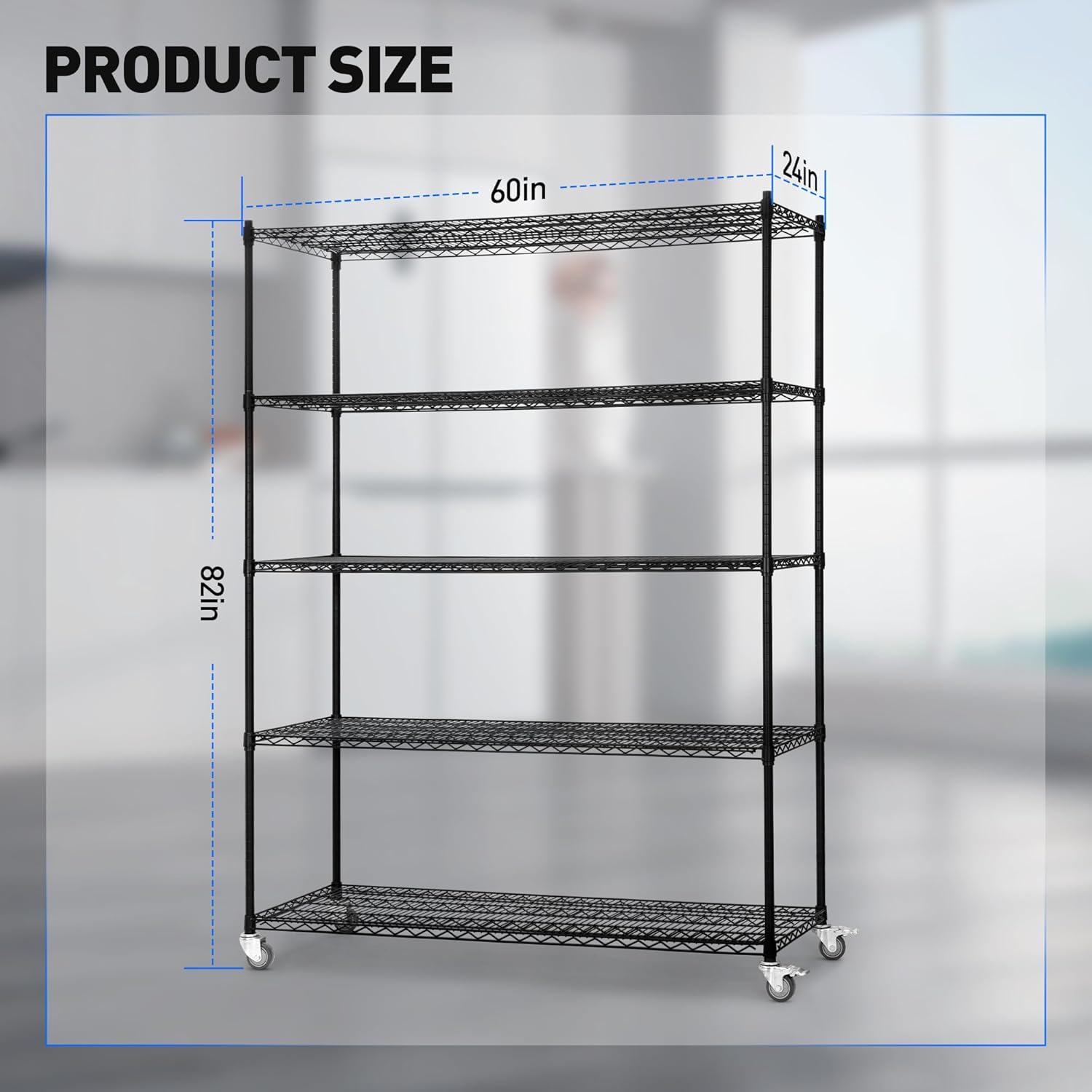 - Perfect Size, Strong Capacity: 60" L x 24" W x 82" H, with high-quality commercial wheels. The 4 wheels can be easily positioned. 2 wheels have a smart lock function for safety. The wire shelf rack has a large capacity and high practicability, and it is the best choice for you to keep the place tidy
