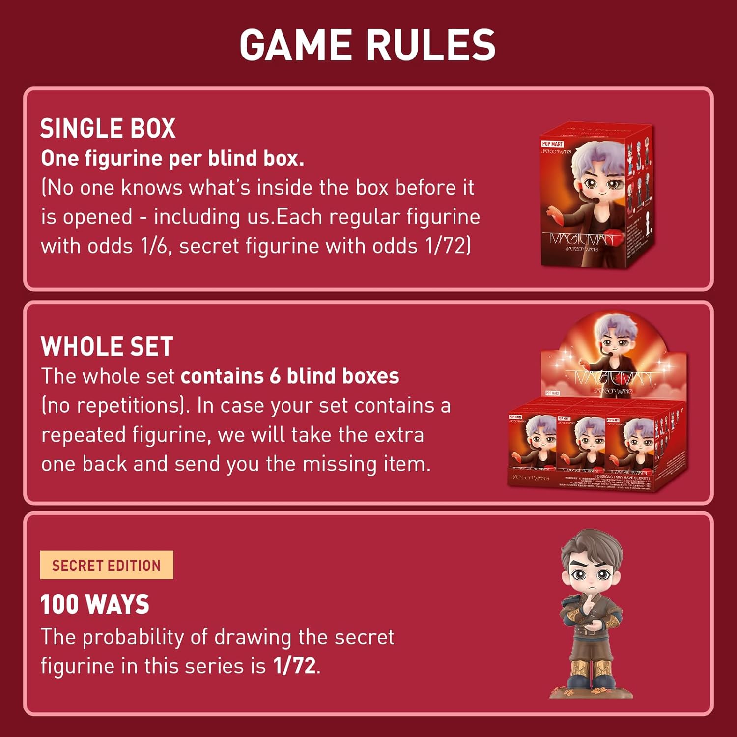 - POP MART JACKSON WANG MAGIC MAN SERIES FIGURES: Blind box contain a random figure from a specific series. One figure per blind box and no one knows what's inside the box before it is opened-including us. This collection contains 6 regular figures, and 1 hidden edition (100 WAYS).