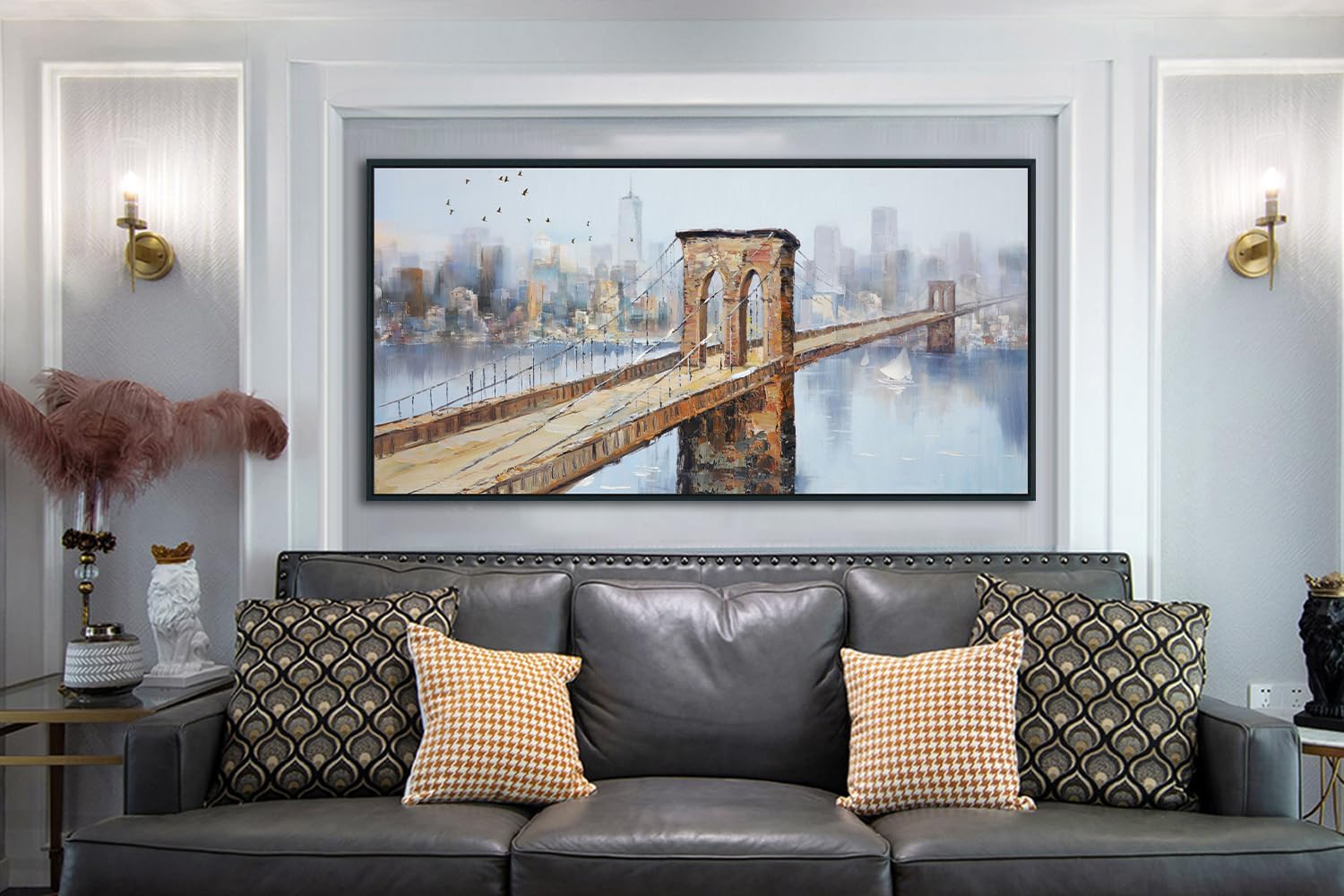 - 🏰Brooklyn Bridge Wall Art Size: 48inx24in(120cmx60cm), wooden framed and hook mounted ready to hang. It's our original design with hand-painted textured embellishment.