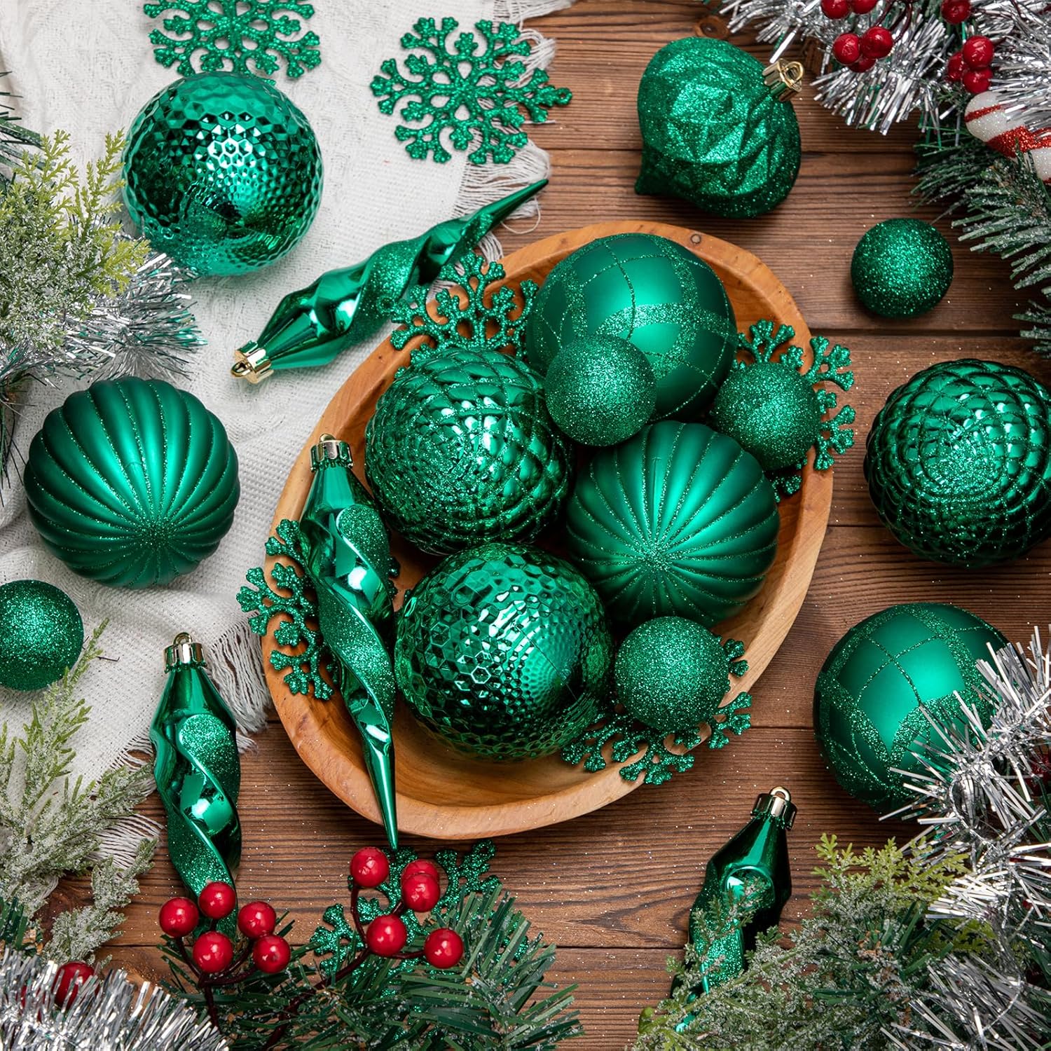 50PCS Christmas Tree Ornaments Set with Shatterproof Balls Icicle Snowflake Hanging Ornaments for Home Office Farmhouse Christmas Decorations, Dark Green