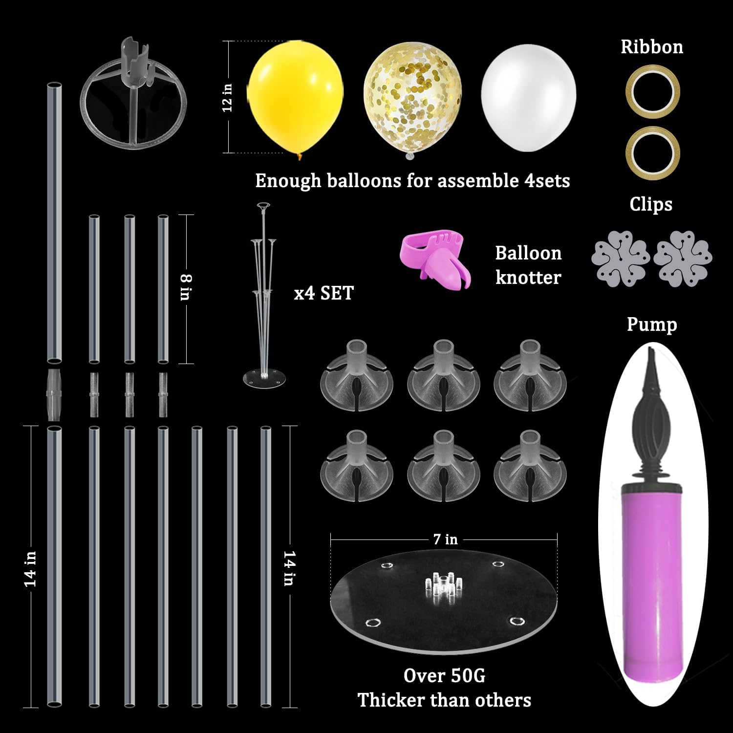 - WHAT INLCUDE: This balloon stand kit include 4 set balloon holders, 35pcs balloons - yellow white balloons and gold confetti balloons, balloon pump, balloon clips, ribbons, glue dots and tie tool