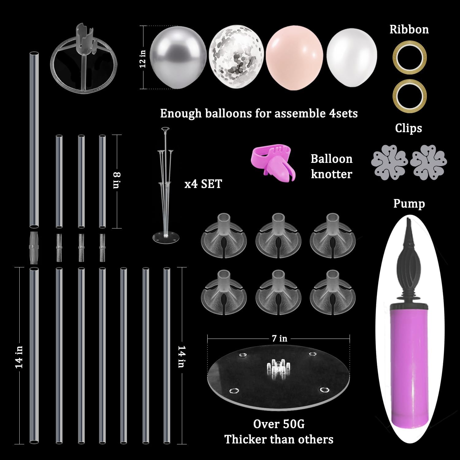 - WHAT INLCUDE: This balloon stand kit include 4 set balloon holders, 35pcs balloons - pink and white balloons, silver and silver confetti balloons, balloon pump, balloon clips, ribbons, glue dots and tie tool