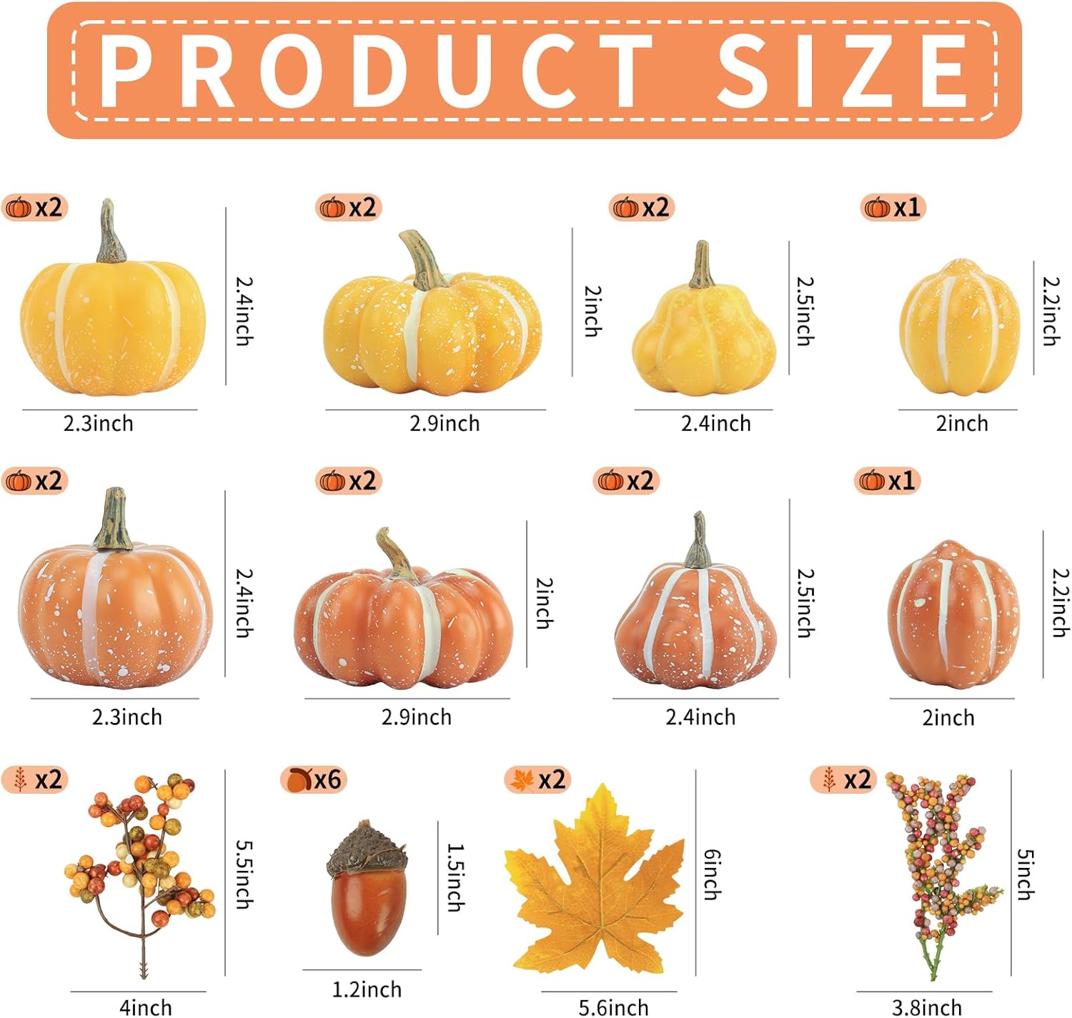 - ăPackage Includedă10 faux pumpkin, 6 acorns, 4 berries, 2 maple leaves. Total 22 pcs, covers all of your fall decorations for home needs.