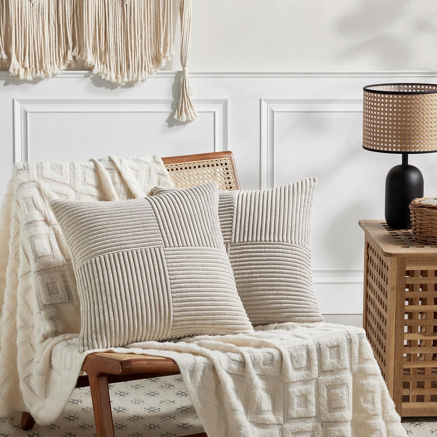 Fancy Homi 2 Packs Neutral Taupe Decorative Throw Pillow Covers 18x18 Inch for Living Room Couch Sofa, Rustic Farmhouse Boho Home Decor, Soft Corss Corduroy Patchwork Textured Square Cushion Case 45cm