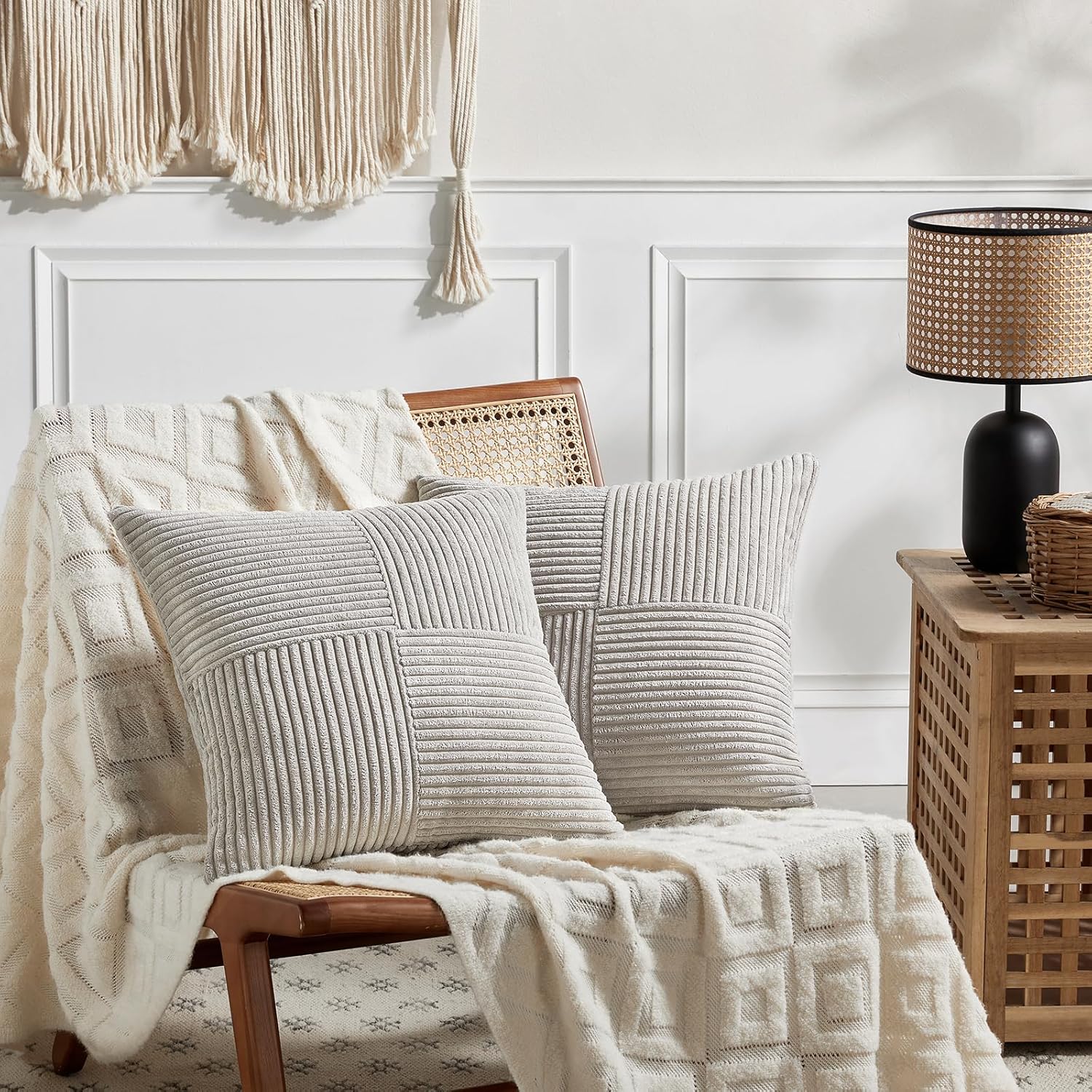 Fancy Homi 2 Packs Neutral Grey Decorative Throw Pillow Covers 22x22 Inch for Living Room Couch Bed Sofa, Rustic Farmhouse Boho Home Decor, Soft Corss Corduroy Patchwork Accent Cushion Case 55x55 cm