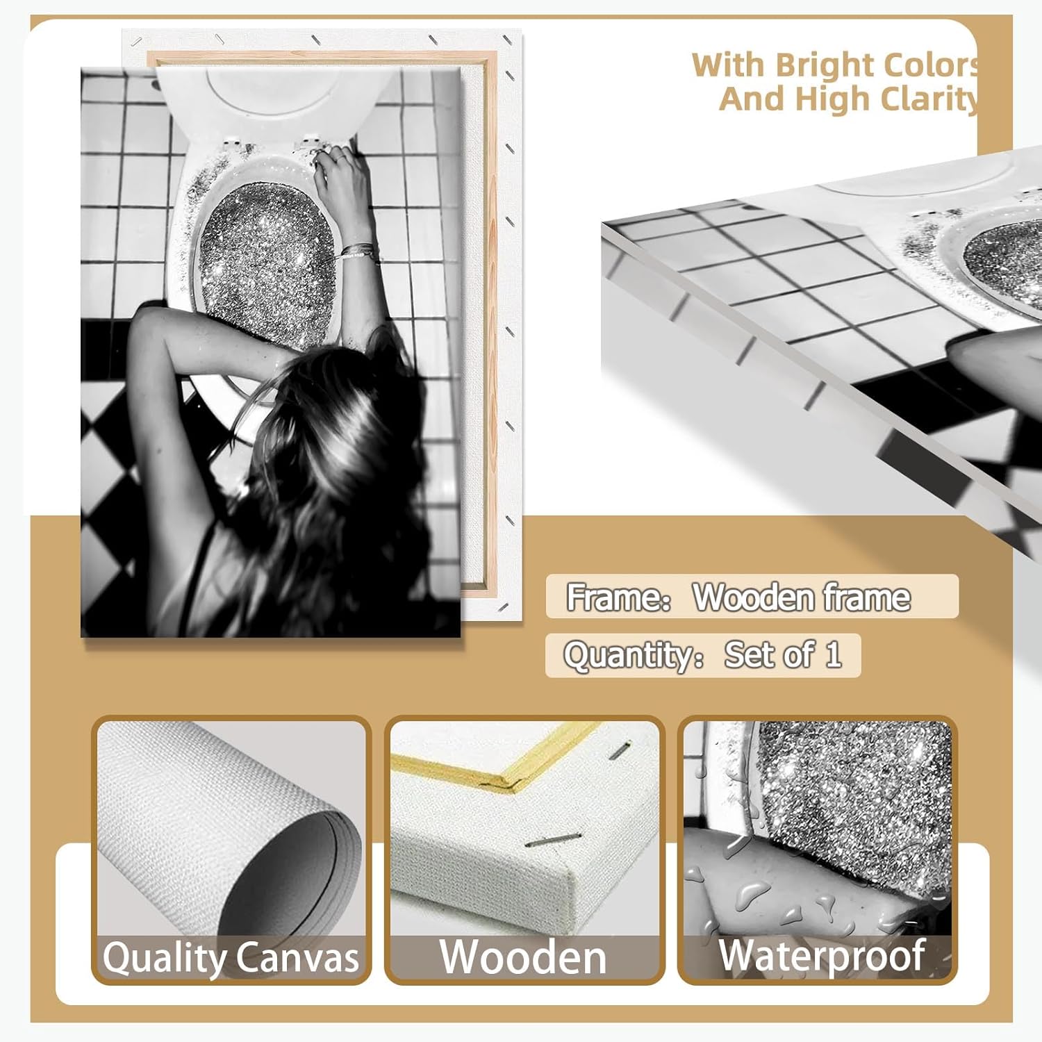 Funny Bathroom Wall Art Black and White posters Bar Disco Party prints painting Girls Bathroom Canvas wall art Funky aesthetics Teen Girl Bedroom wall decor for 16x24in Framed