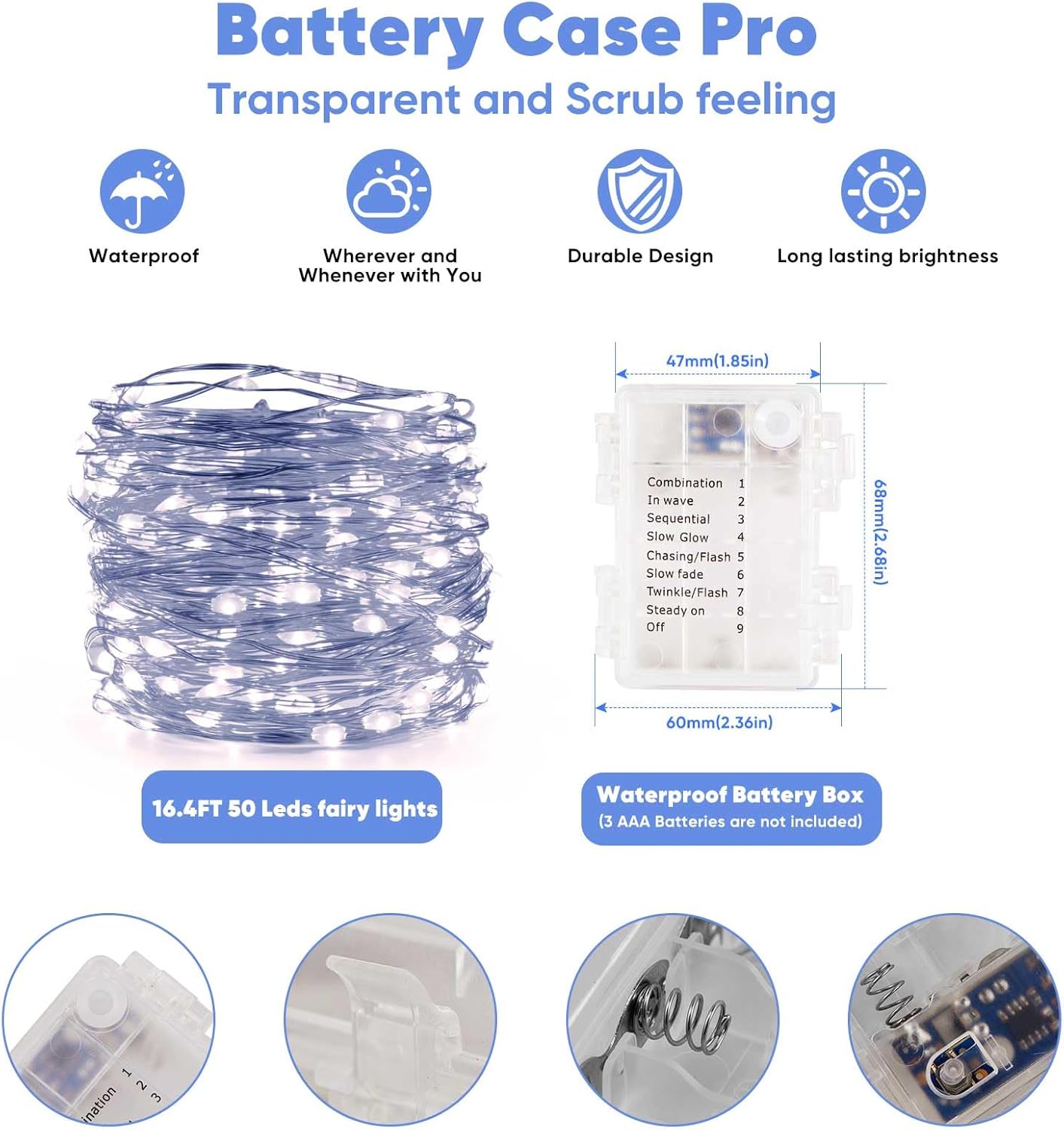 1 Pack 16.4 Ft. Battery Operated Outdoor String Lights with Remote & Timer, LED Cool White Fairy Lights, Waterproof Twinkle Lights for Bedroom, Dorm, Mason Jar, Wedding, Party, Christmas