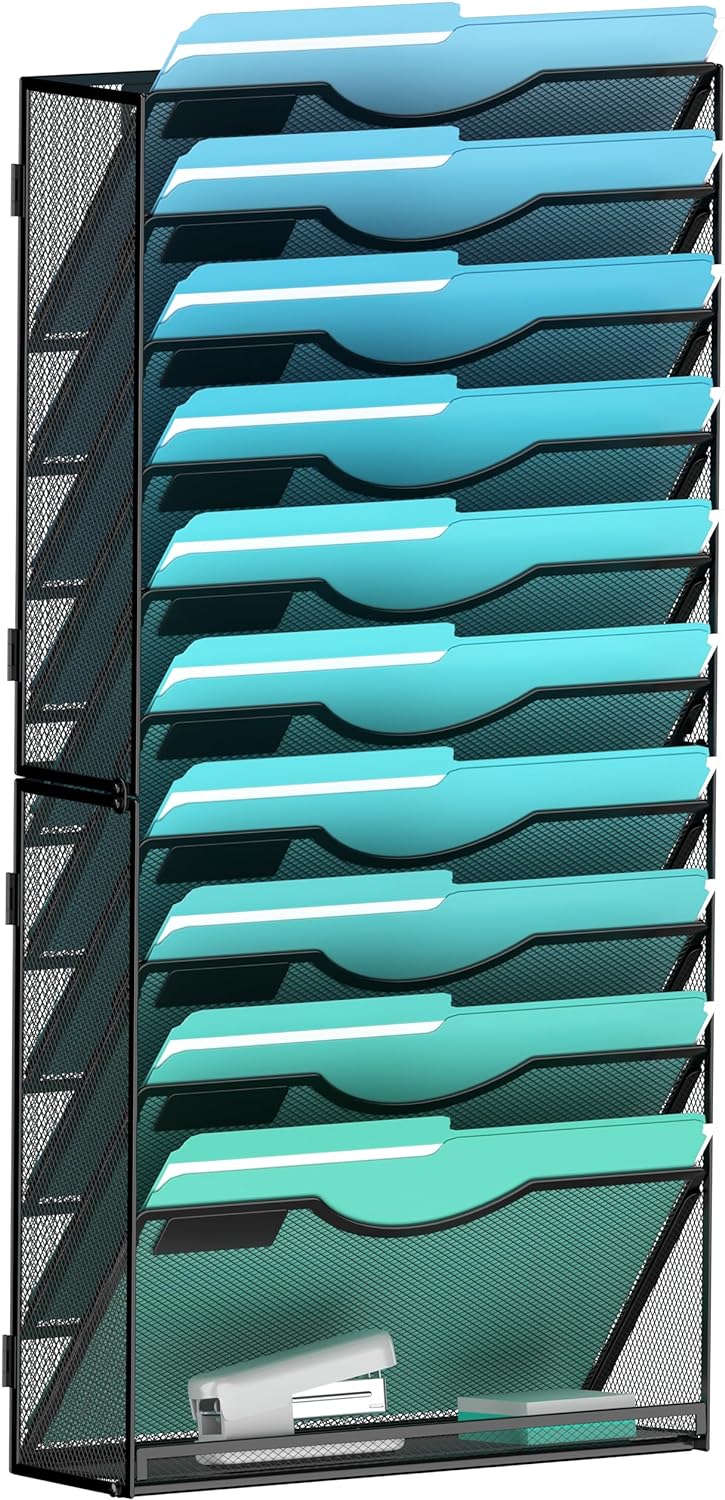 11-Tier Wall File Organizer Hanging Wall File Holder Wall Mount Paper Folder Organize, Mesh Magazine Document Mail Organizer Wall Organizer for Office School Home, Black